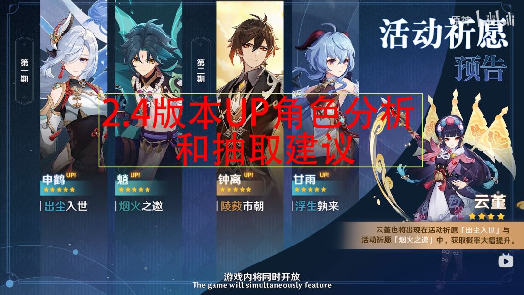 根据官方直播,申鹤和魈会在2.4版本第一期UP池,同时四星角色云堇也会在该期池子;钟离和甘雨则是在2.4版本的下半池子。