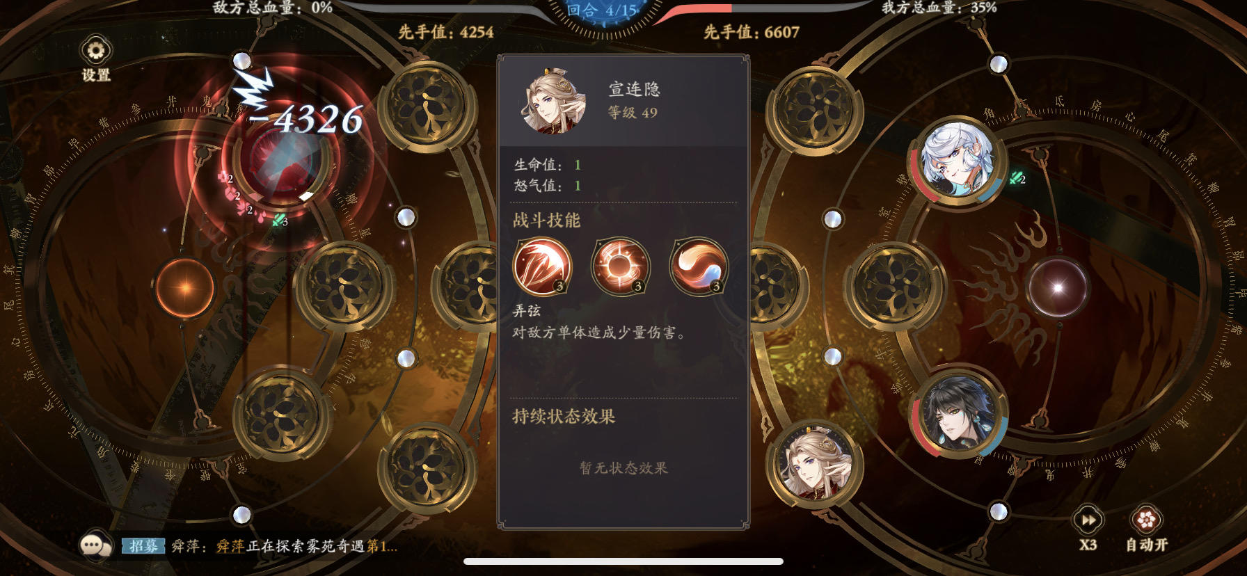 主要用他那个被动 挺过一轮就是胜利重点一:宣和苏 带鼠 和带鸡 原因是要让逍遥第一轮先于了了放出大招(当然如果你的逍遥已经突破到开局自带15怒就可以不带🐔)因为宣会给了了加怒,不能让了了先逍遥后(否则印记引发不了沉默控制)
