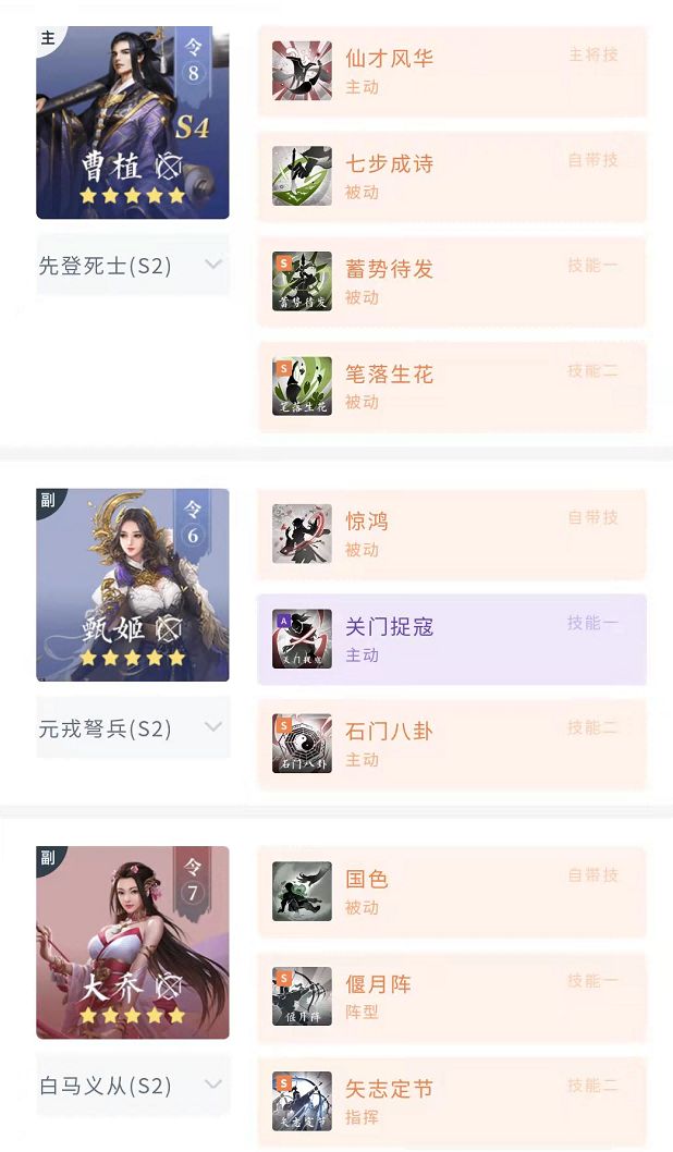 该阵容的原始框架类似于S4的魏控队(曹植、曹操、郭嘉),输出方式依旧是以控制触发曹植技能。副将选择具备高频群体缴械的甄姬,为队伍提供的核心控制施加,另一名副将选择大乔,限制以主动技能为主的敌人,她也是最适合担任队伍前排的武将。全队依靠控制与甄姬主将技的伤害削弱,配合矢志定节的防御加成,能直接提升队伍持久战斗能力。