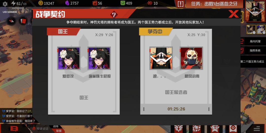 依旧是一共完成六次发射,每次发射携带骑士在王国商店消耗的弹头,最终结算弹头最多的一方势力获得胜利和游戏奖励,国王依旧无法消费弹头,只能获取消费密钥。