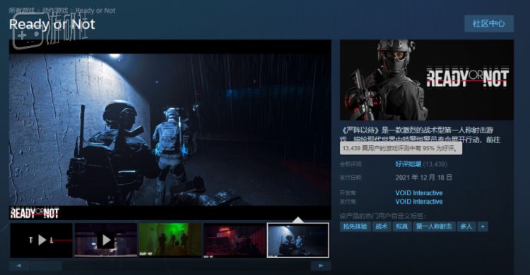 上周登顶Steam平台销量周榜的作品,是由Void Interactive开发的第一人称战术射击游戏《严阵以待》(Ready or Not)。《严阵以待》主打室内近距离的反恐作战,玩家将扮演一支特警队伍对抗恐怖分子,完成拆除炸弹、解救人质、捉拿嫌犯等任务。
