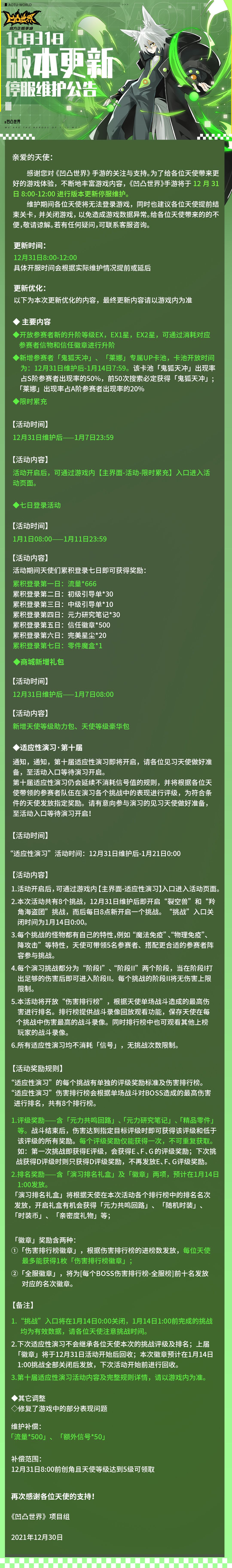 感谢您对《凹凸世界》手游的关注与支持。为了给各位天使带来更好的游戏体验,不断地丰富游戏内容,《凹凸世界》手游将于12月31日8:00-12:00进行版本更新停服维护。