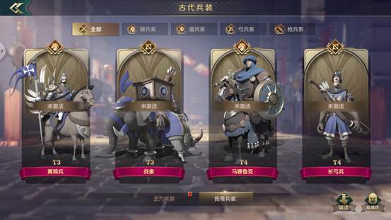 传奇兵装与主力兵装最大的不同在于,该部队还具有特定的/技能加成;大家可以理解为传奇兵装即是特殊部分,不仅外观特殊,还非常强悍。如跑图更快的翼骑兵,专打据点部队的战象等