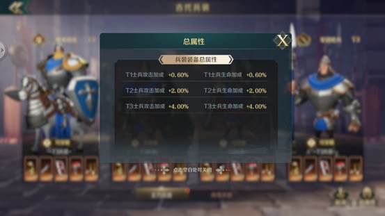最重要的效果是提升预备兵的转化效率,其次还可以获得兵种的攻击力和生命加成,且四大兵种的加成是共享叠加的,即其中一个兵种穿戴一件兵装,那么四大兵种都能获得兵种的攻击加成和生命加成。