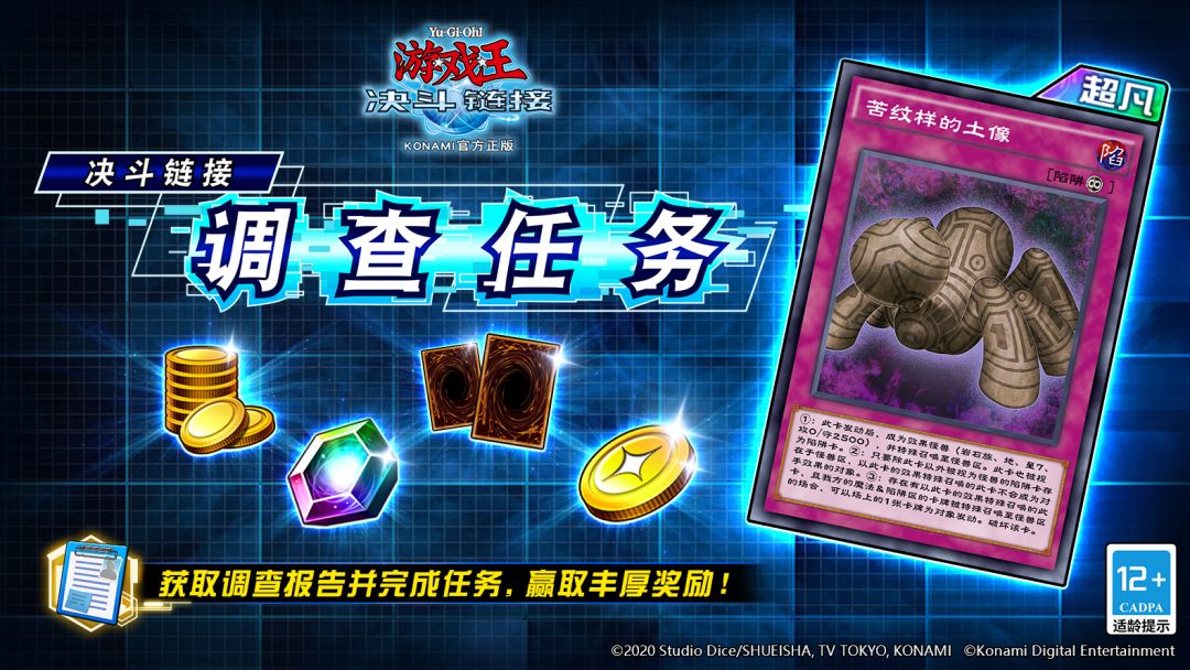 【决斗链接调查任务】将于12月31日开启!通过与标准决斗者决斗或进行排名决斗,就有机会获得随机的调查报告,完成调查报告上的任务来获得奖励与积分,累计积分就可以获得超凡卡「苦纹样的土像」,稀有卡「魔装战士 水陆龟」以及宝石、金币等奖励!