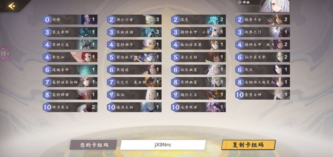 幽莲阴:舍弃噩兆先知,因为在我看来就是个看脸怪,不怕快攻就是怕阴内战和侠客土,因为整体卡组质量没有贪阴高,苍狩群猎可更换东海,同时问情也是神卡,有优势的情况可以贴给白莲,也可以劣势防对面大怪,拿怪往前面挡就完全不用怕上限阳,各种消灭清场,一般情况有大就大,凋亡凝月放大哥前面解巨型解部署,从而有更多机会来打对面脸。