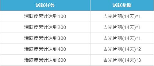 2、累计活跃度达相应值,可从活跃任务处获得吉光片羽奖励。