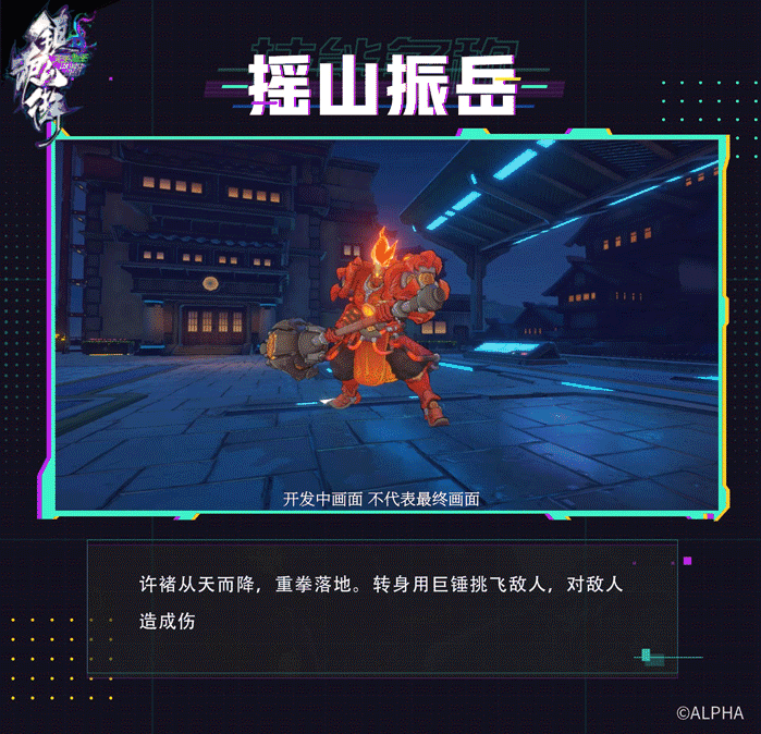 比如许褚,周身通红的盔甲,手持大锤,再结合自己庞大的身躯,在曹焱兵的攻击攒满硬直后,召唤许褚释放摇山振岳,用巨锤挑飞敌人,造成伤害。