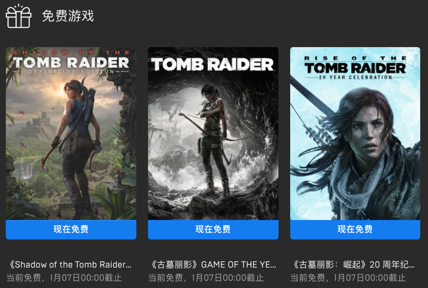 《古墓丽影9 年度版》、《古墓丽影:崛起 20周年纪念版》、《古墓丽影 暗影:终极版》都可以直接领取入库了,领取时间截止到1月7日0点。我们也直接把本版块的名字“PC | Steam”改成了“PC | Steam | Epic”。