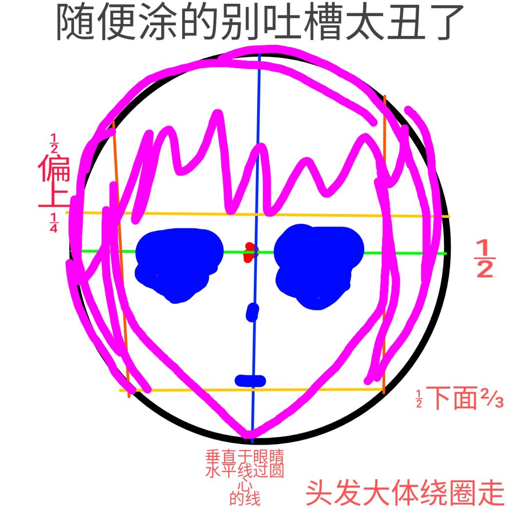 以圆心和圆心重合的水平线为基准,往上偏半径的1/4下面画眼睛。眼睛的间距和大小与绘画目标年龄有关。例如你画小萝莉,眼睛间距就应该远一点,眼睛就应该画的圆一点大一点,位置应该下移一点,反之成人的眼间距会小一点,眼睛也会小一点扁平一点。