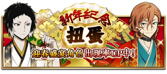 ①期间限定扭蛋:SSR【迎春盛宴】芥川龙之介、 SSR【迎春盛宴】梶井基次郎、SSR【迎春盛宴】中原中也、SSR【迎春盛宴】广津柳浪、SSR【迎春盛宴】银&立原、 SSR【迎春盛宴】森鸥外、SSR【迎春盛宴】尾崎红叶、SSR【迎春盛宴】梦野久作。