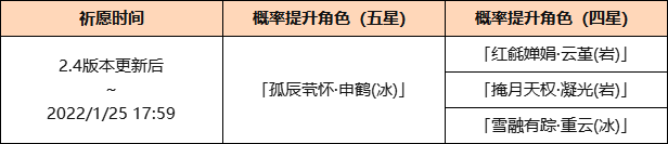 ●活动期间,限定五星角色「孤辰茕怀·申鹤(冰)」的祈愿获取概率将大幅提升!