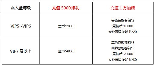 活动时间内,所有线下名人堂VIP5及以上玩家,在活动期间内的充值,达到要求后可以获得额外奖励哟!(只能领取对应VIP等级奖励)