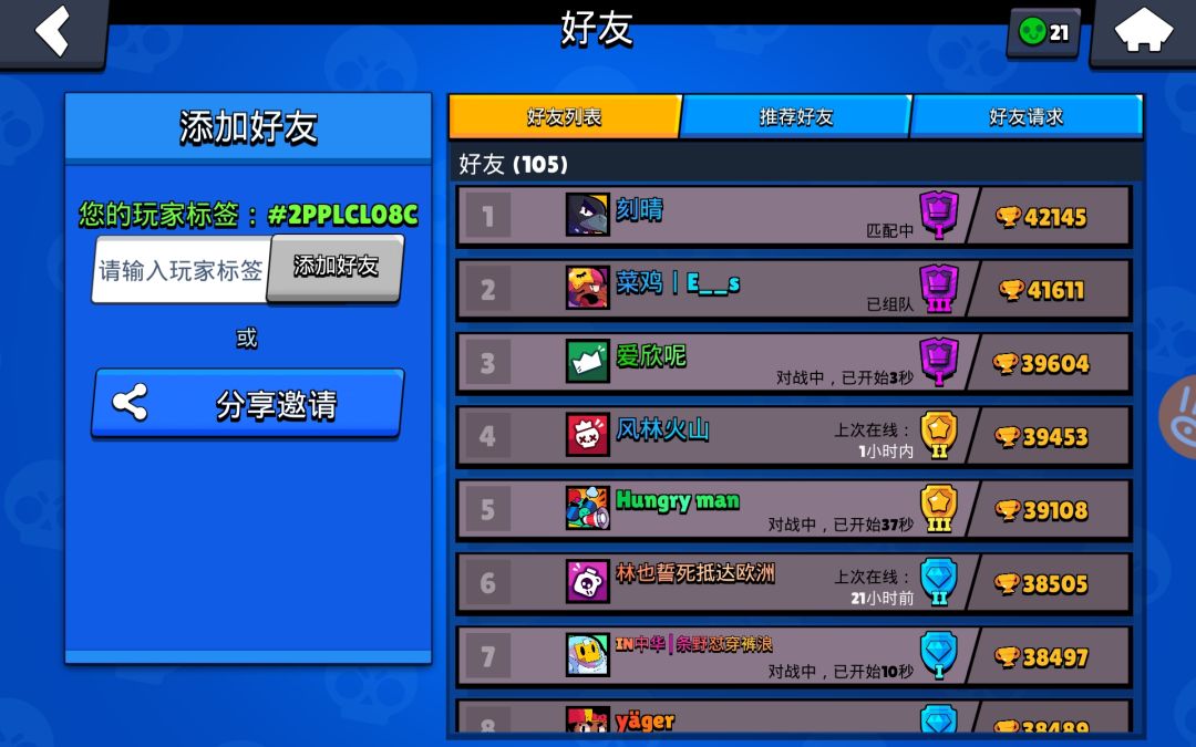 好久没加过好友了 一般都和战队成员组队玩 再加上一些好友退坑了 就突然发现在线的好友好少啊😂