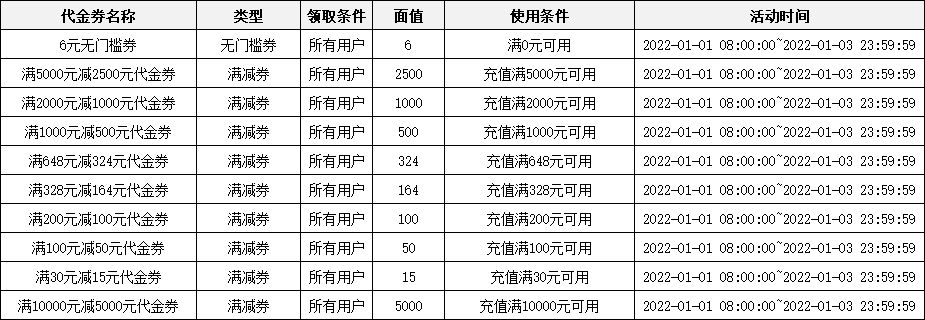 活动时间:2022年1月1日8:00:00——2022年1月3日 23:59:59