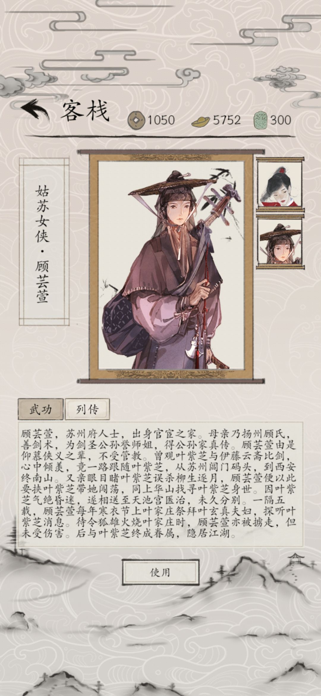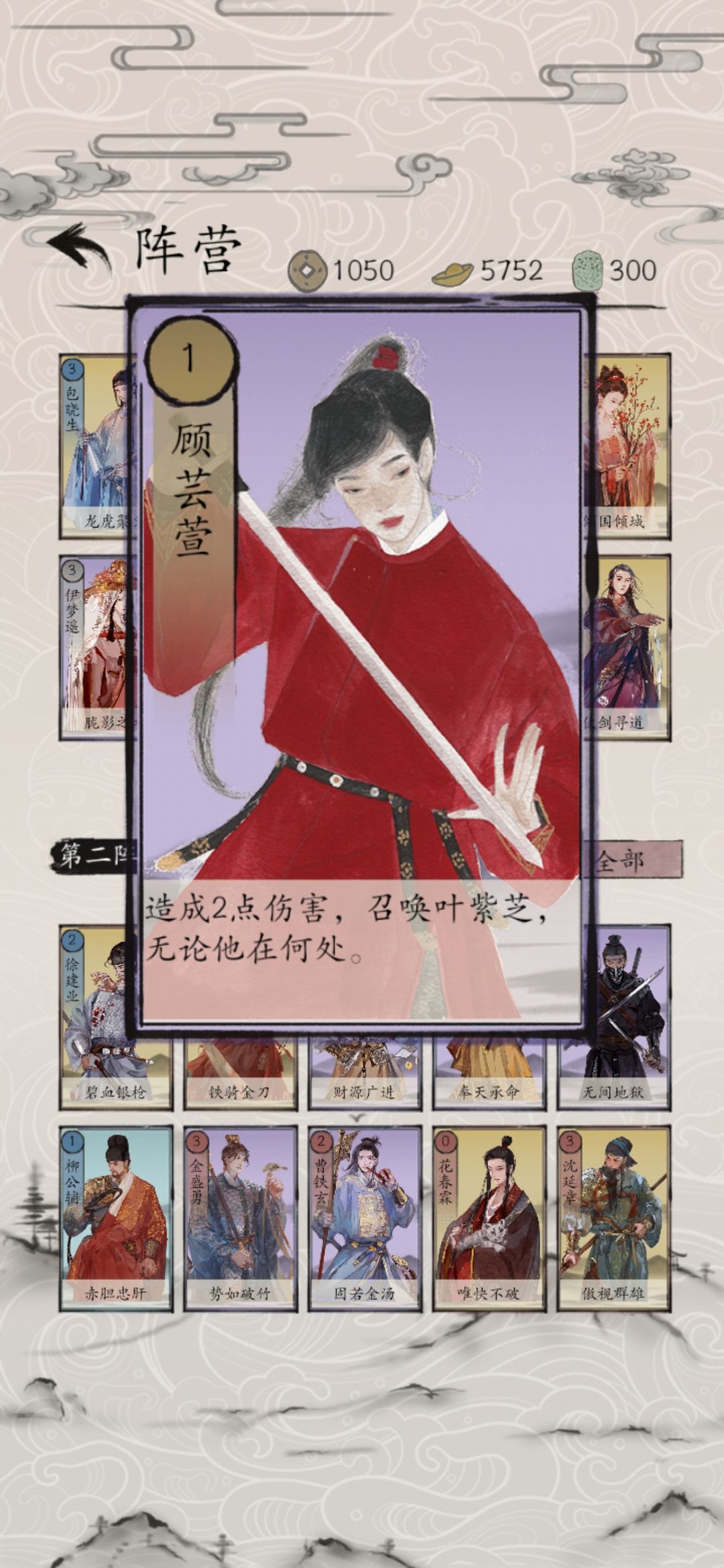 顾芸萱,所属阵营江湖。其母亲顾氏乃是公孙誉的大师姐,得公孙家剑术真传。顾芸萱是小说中女侠形象的代表,其武功技能为:“萍踪侠影”,技能效果为:“造成2点伤害,并召唤叶紫芝到手牌。”顾芸萱为1点策令消耗的卡牌,虽然伤害并不起眼,但能够召唤剑神叶紫芝,使得叶紫芝的伤害快速叠加,顾芸萱和叶紫芝的组合,是高伤害卡组的优先选择,在战局陷入持久战时,叶紫芝能够实现一击斩杀。