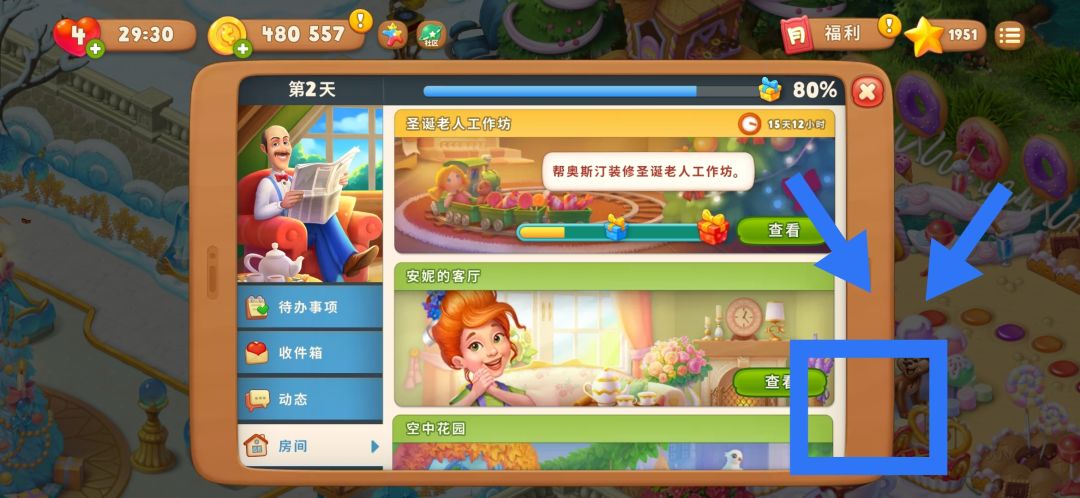 ▶如图,在游戏界面左边,图标的就是圣诞老人工作坊房间装修入口。