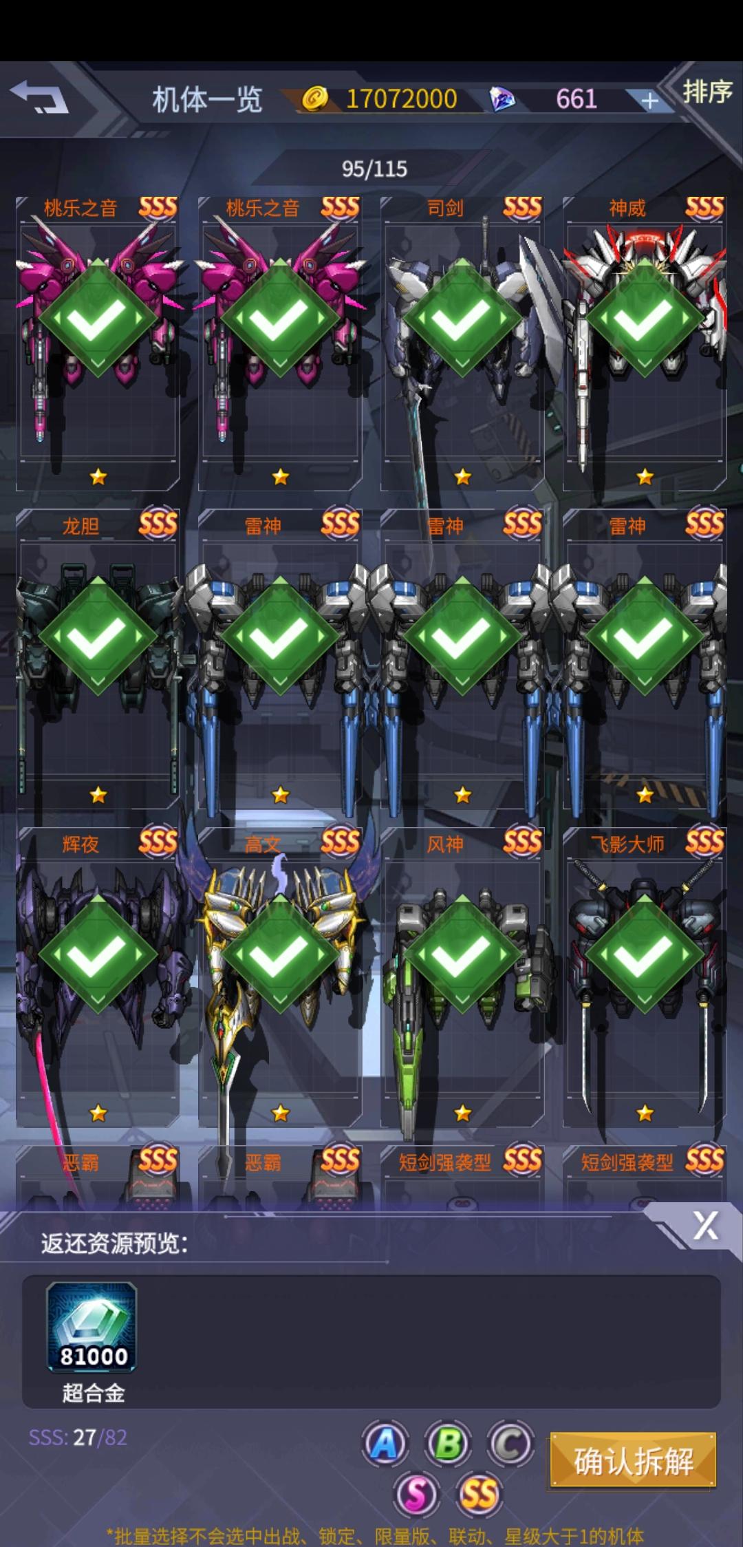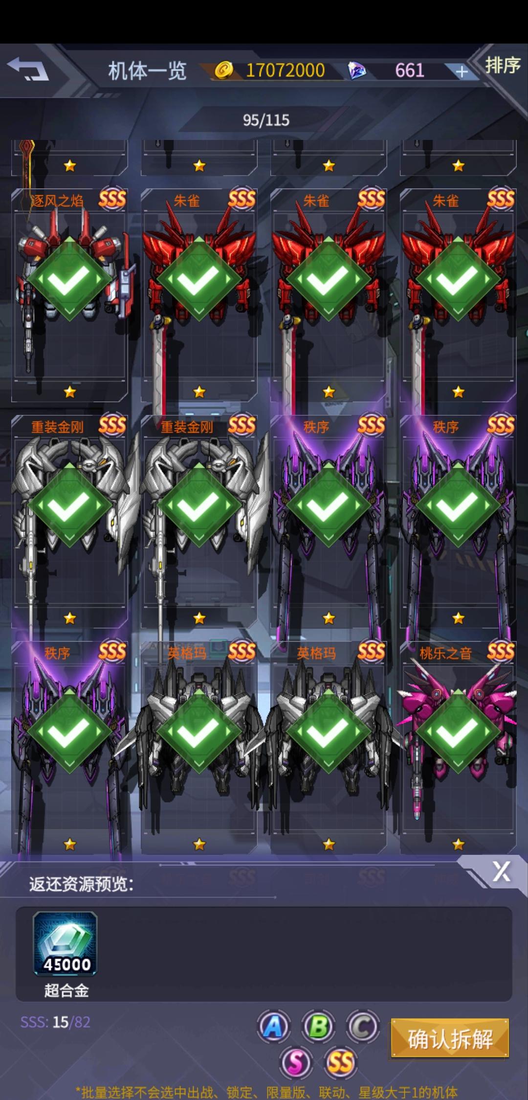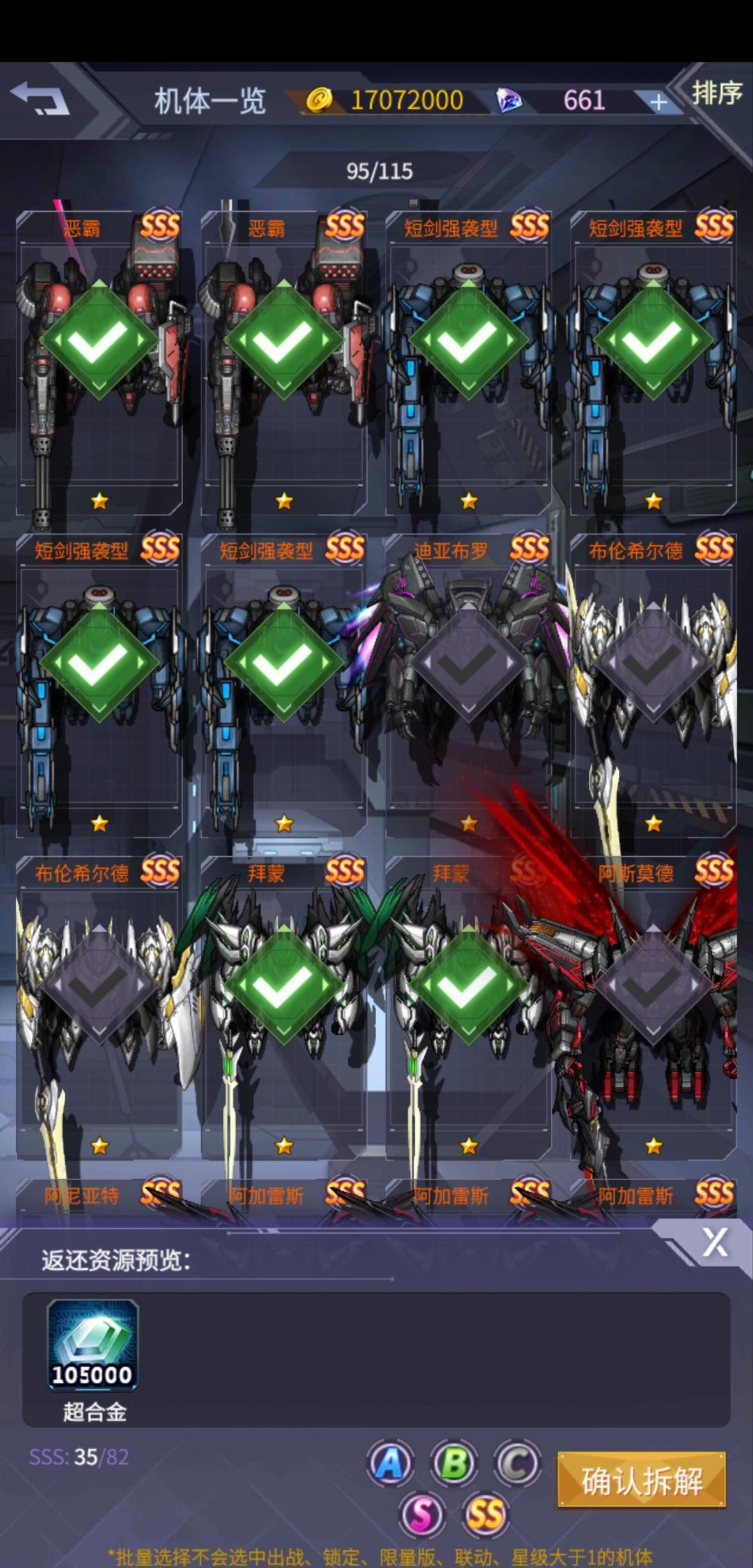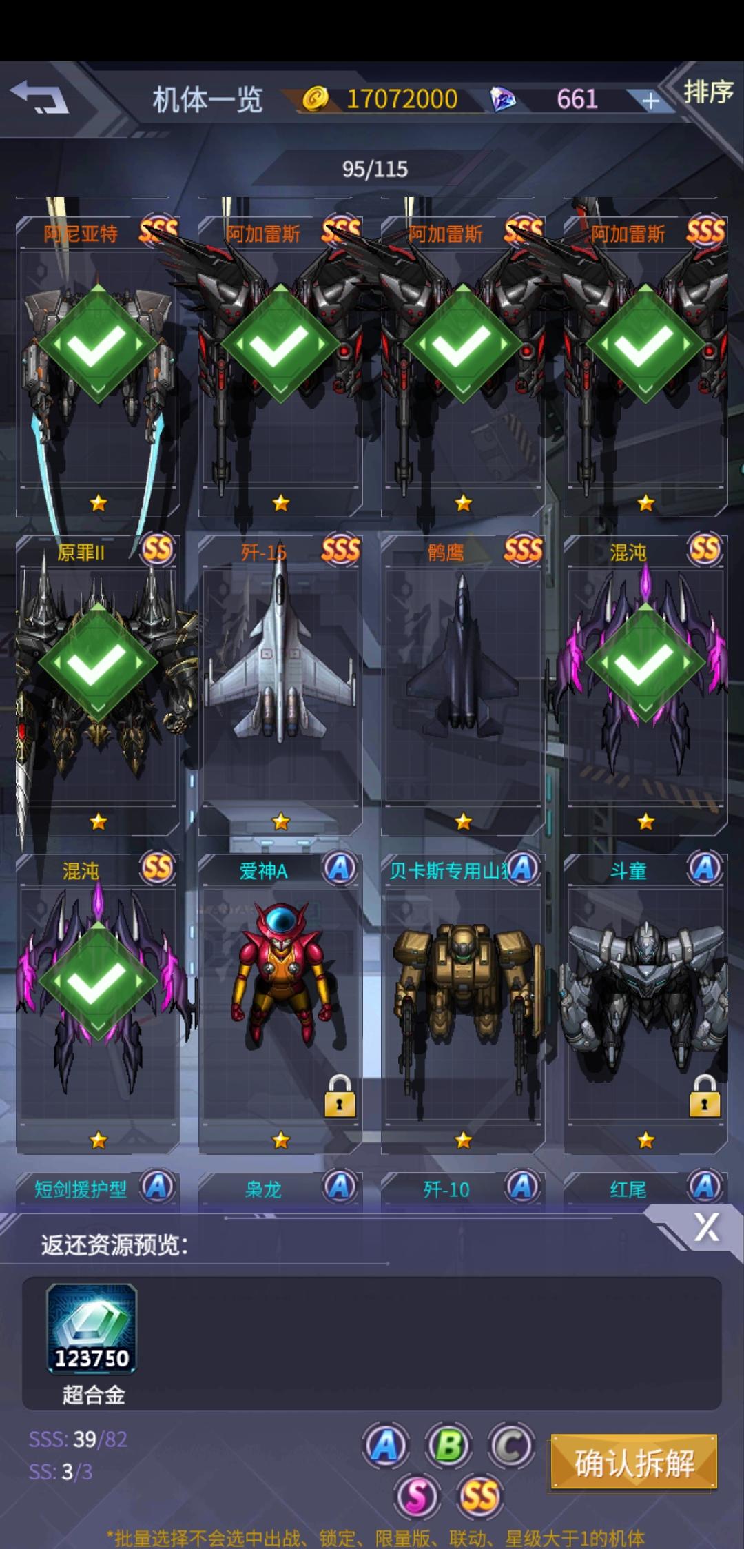 现有机体如下,拆除一部分之后也就只有12万多点合金,但拆了这一堆换太阳之翼值吗吗?拆的机体大多都是合金商店和活动换来的。征求一下大家的建议,目前很犹豫。