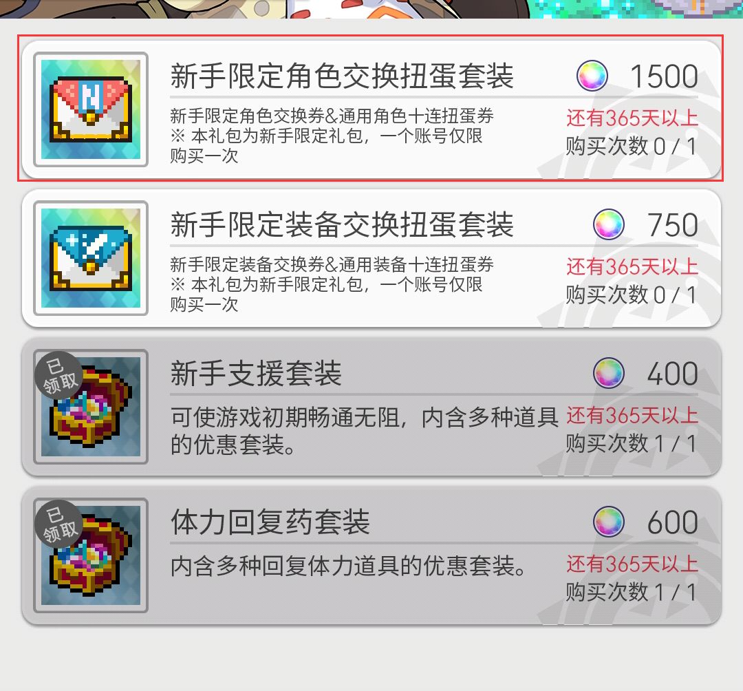 2.新手超得(新手限定角色交换扭蛋套装)——付费1500石头购买。礼包内容不会随版本更新。后续会出新的超得礼包。按需购买。