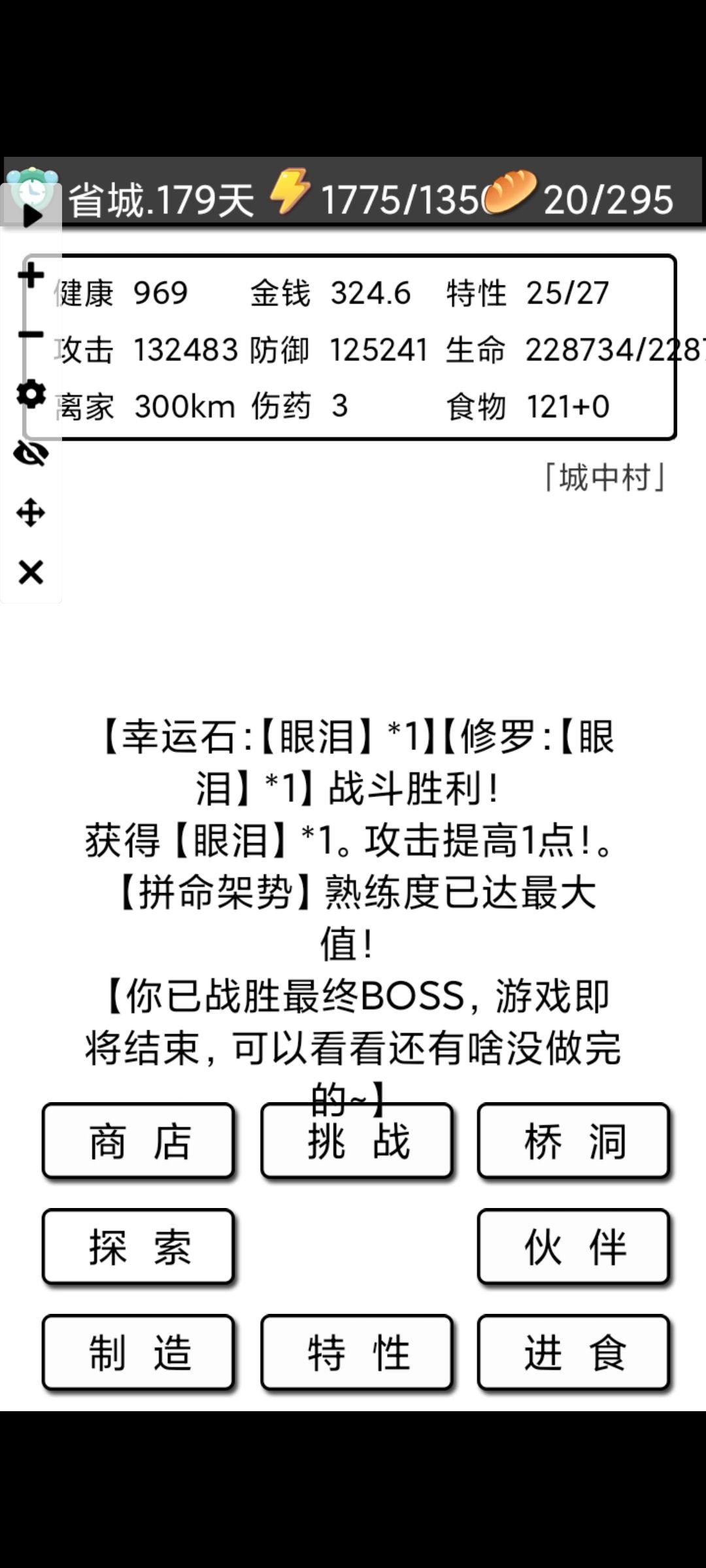 城中村刷段时间就可以去市中心了,我是直接在市中心刷的,开始烟有点不够,城中村得的啤酒续了之后就能循环了。不过推荐前面在郊外刷因为有果子不用续食物。
