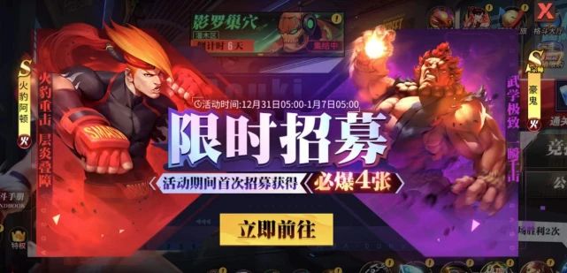 12月31日,《街霸:对决》开启限时招募活动,即日起至2022年1月7日05:00,大家参与招募即有机会获得全新格斗家火豹阿顿,宗师豪鬼限时返场活动也同步上线。
