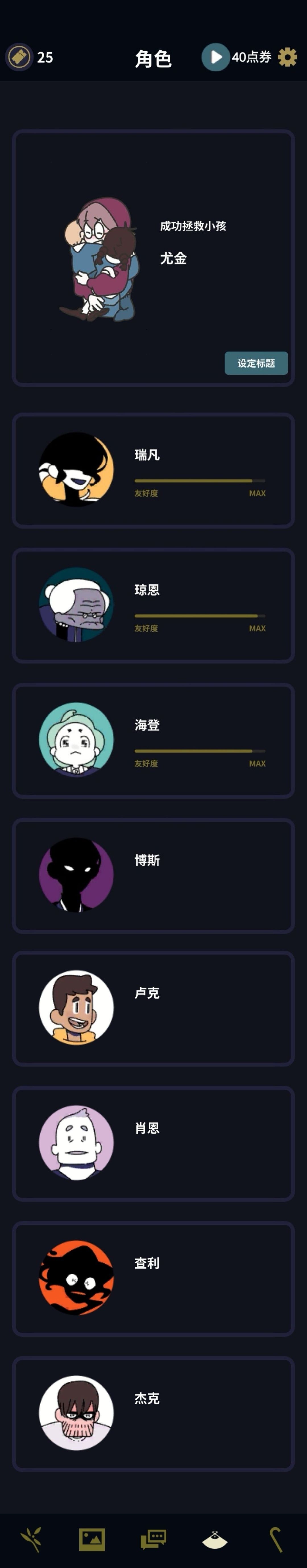 打隐藏场景(标题)、专辑、结局也可以参考,浏览器搜TapTap的网页版,页内查找比较方便,想了解所有故事可以按照全局恶人和好人做到底来玩,这样比较全,但有些还是得反复打,建议把剧情线正常走一遍,该有的都拿到,再去试。悄悄说读档是获取离线奖励的一个好方法要完整的解锁过一个结局后,角色页面才会出现友好度!友好度有数值的条是金色的!!!所以刚玩完一个结局看到的是一个灰色的空条,是0啊喂,MAX只是代表一个尽头的端点,不是指具体数值,友好度的高低得看金条有多长!攻略友好度最好一口气玩下来,直接点后面的章节,友好度可能还会是之前的!