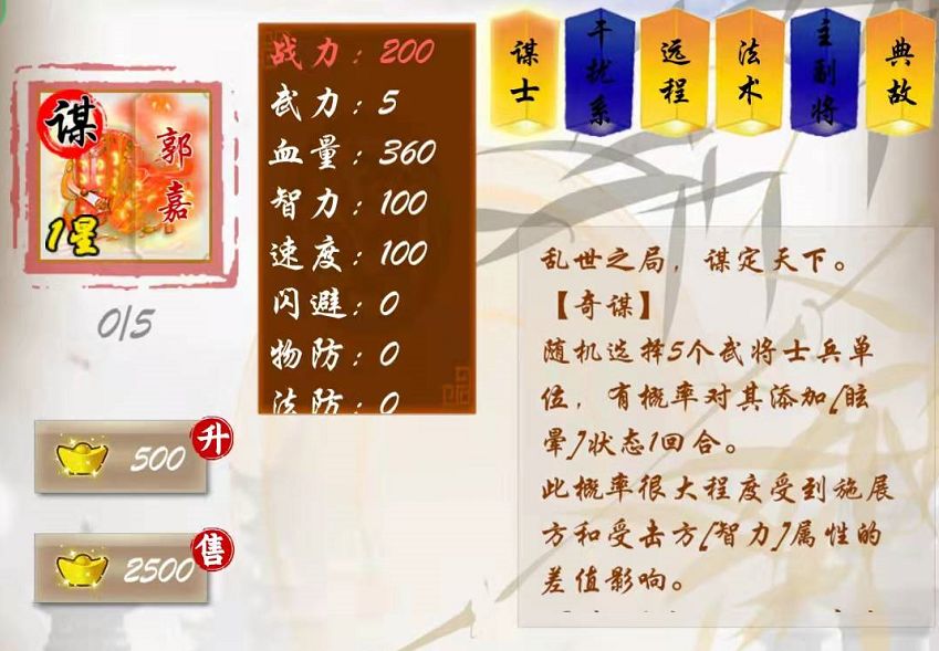 新版本中,武将角色都带有智力属性。智力属性属于固定属性,同速度、闪避等属性一样,目前不会随星级提升而提升,但往后可能会随着觉醒而提升。