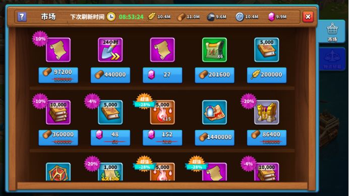 一般打折的道具建议按需购买。可以用宝石买一些打折的常见道具、或者一些开宝箱的钥匙。建造资源不紧张的时候可以用木材多解锁几个摆摊位,偶尔会有稀有道具的产出~