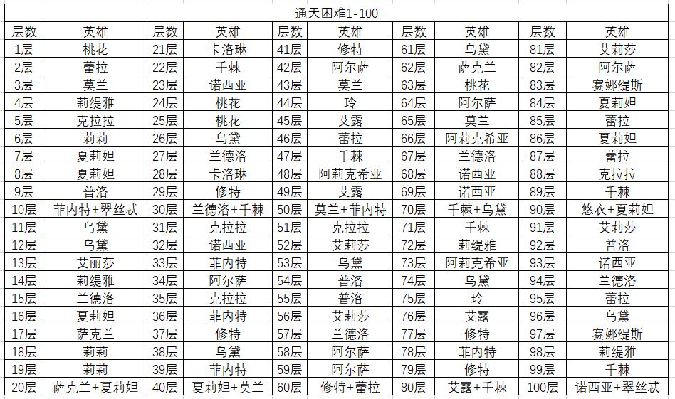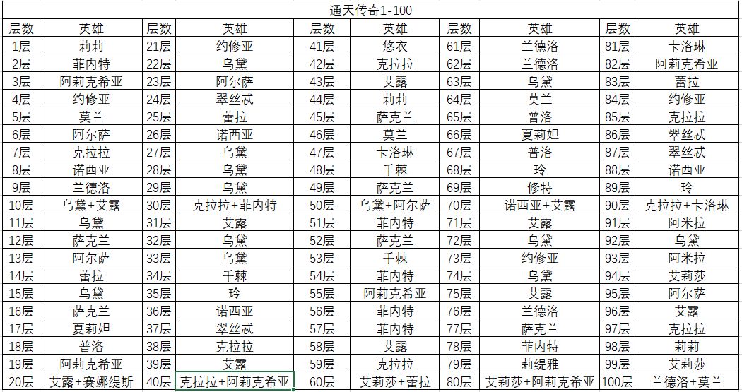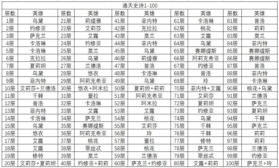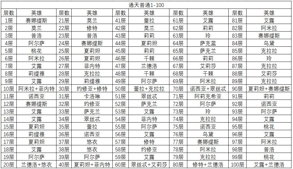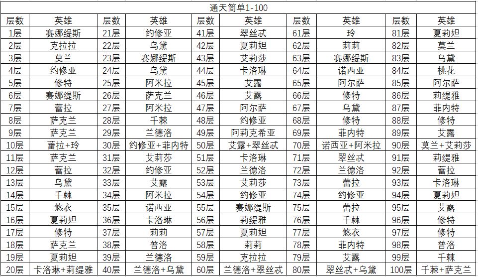 以上是通天塔1-500层的英雄数据,简单说一下,通天比较难打的一是阿莉克希亚(女仆),二是莉莉,一般卡关都是卡在女仆身上,作者经过多方验证,可以确定的是打女仆效果最好的是艾莉莎(小红帽),至于莱雅和狮子的问题,主养哪个就哪个吧,不用太纠结~~~