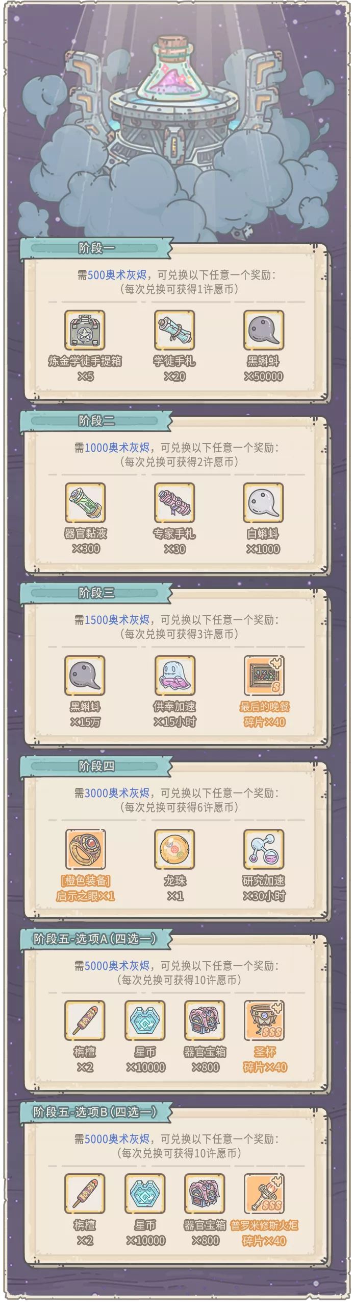 活动期间,贩售机将出现福利礼包,每天5点刷新,售价1白蝌蚪。内容为:白蝌蚪×20、许愿币×1、奥术灰烬×100