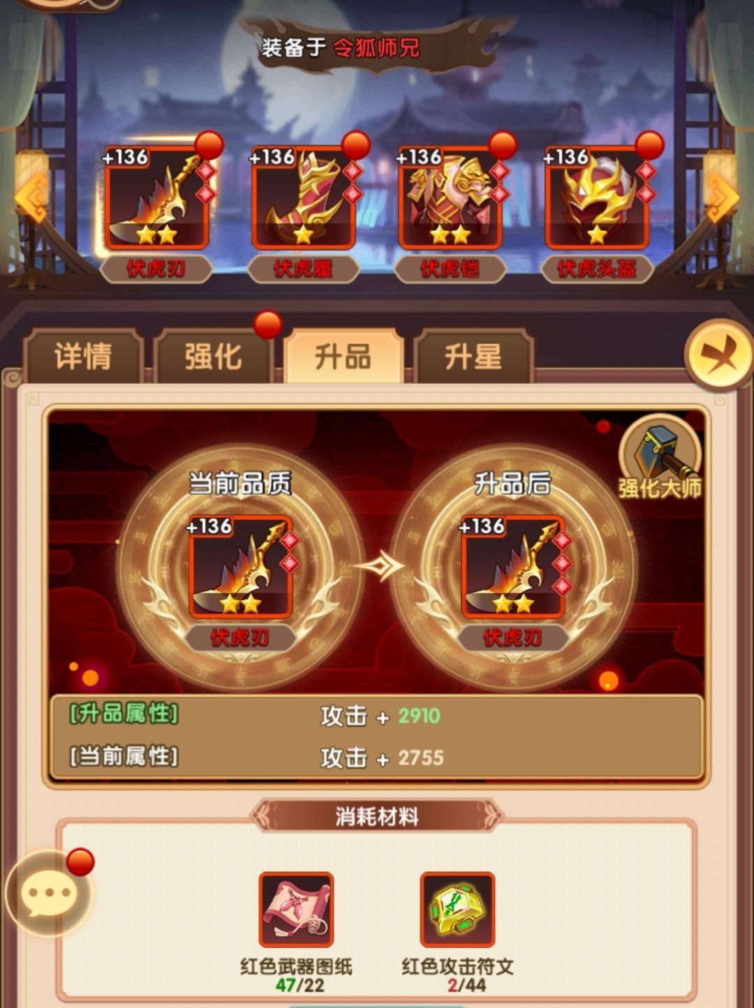 装备上全力升令狐,其他人物基本只在资源溢出比较多的情况下,点下装备等级