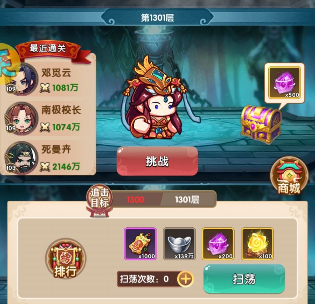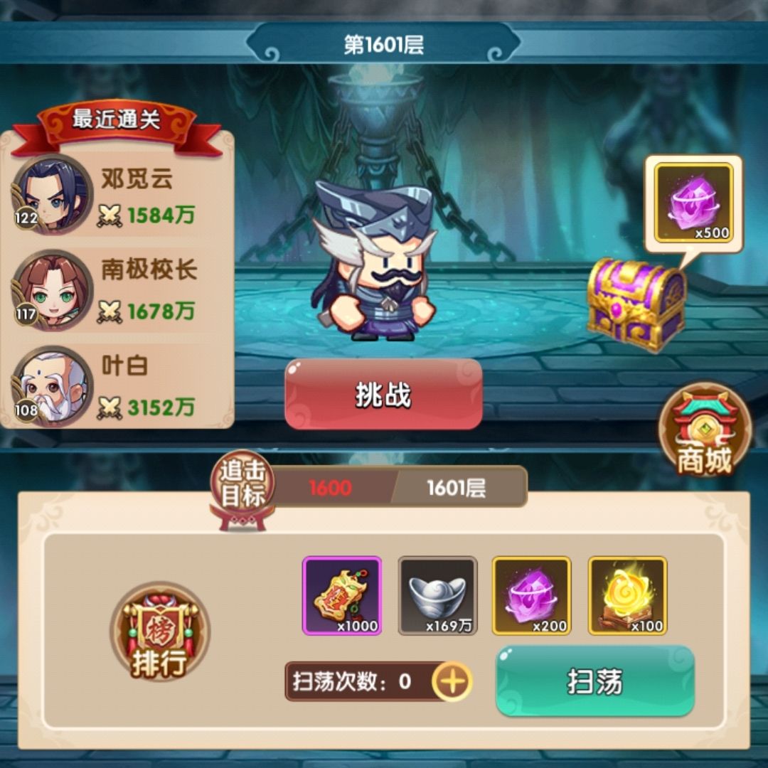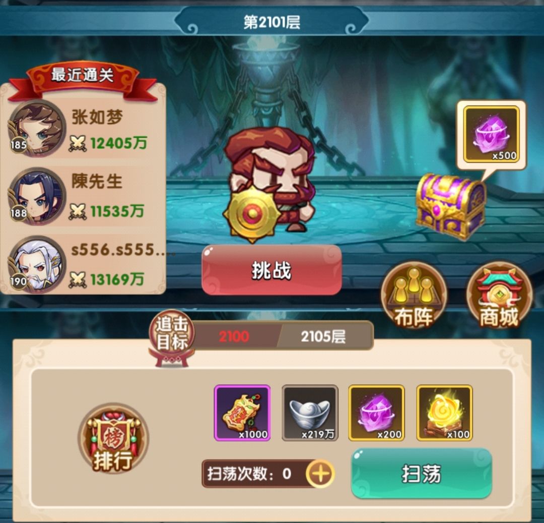 主力等级已经升满,开始有资源升一些其他人物,其实实战效果很明显铁掌换赤练效果会更好,补了赤练的等级,然后又爬了一波塔,成功到达2000层