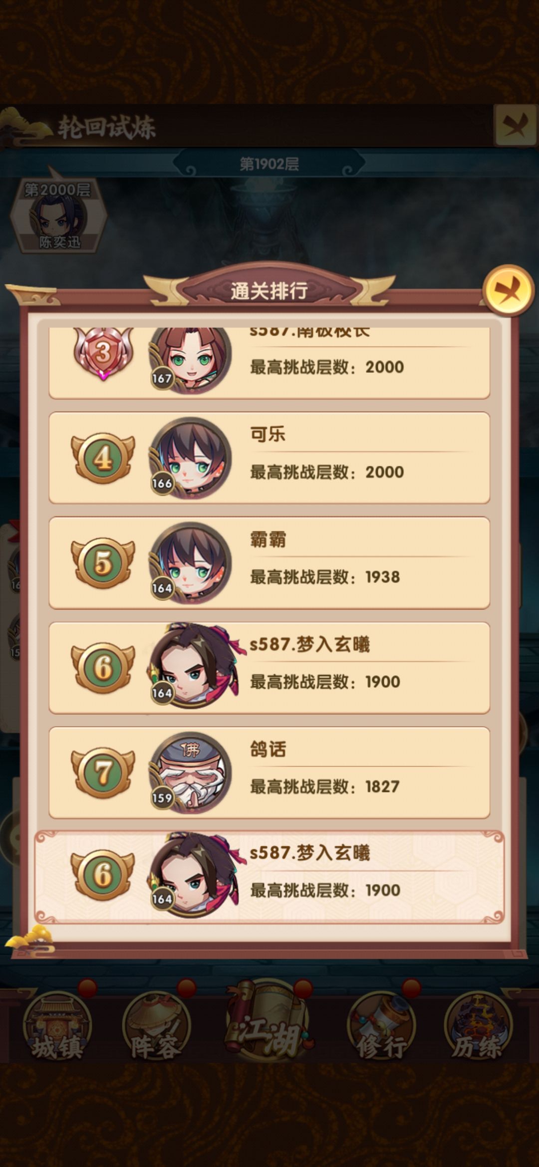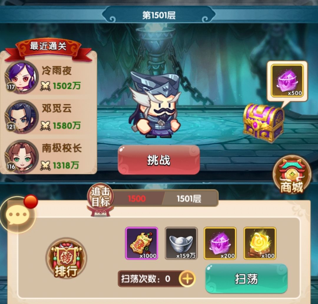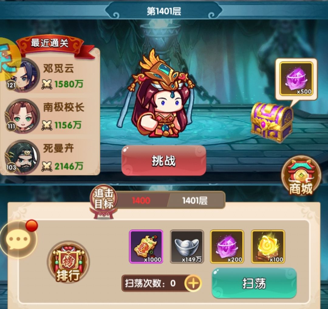 主力等级已经升满,开始有资源升一些其他人物,其实实战效果很明显铁掌换赤练效果会更好,补了赤练的等级,然后又爬了一波塔,成功到达2000层