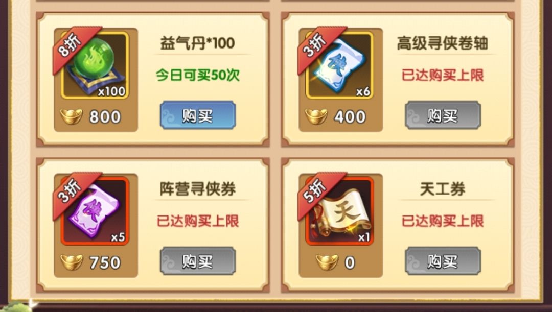 氪的方式就不多说了,按平民玩家考虑,第一来源实际上是80次阵营保底,当然每次保底出的是随机的这个比较看人品,但至少确实是稳定的来源,而每天都有5张打折的阵营券是必买的,我这边每天会固定购买两个3折的券,以及天工,道理很简单,高级寻侠用于提供狗粮,阵营用于抽隐,激活绘卷,天工则是因为宝物没有其他可靠来源,因此我自己每天都会买,当然这里面400+750+1500的元宝要求,每天确实是有些开销的,而前期一般来说不会有太多的元宝富余,所以前期不用考虑,抽隐得到中后期再进行