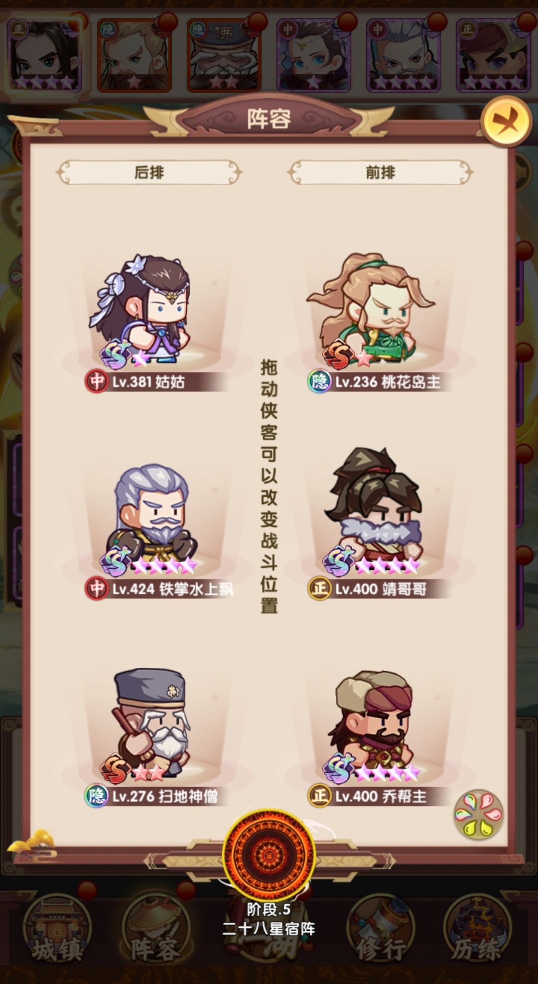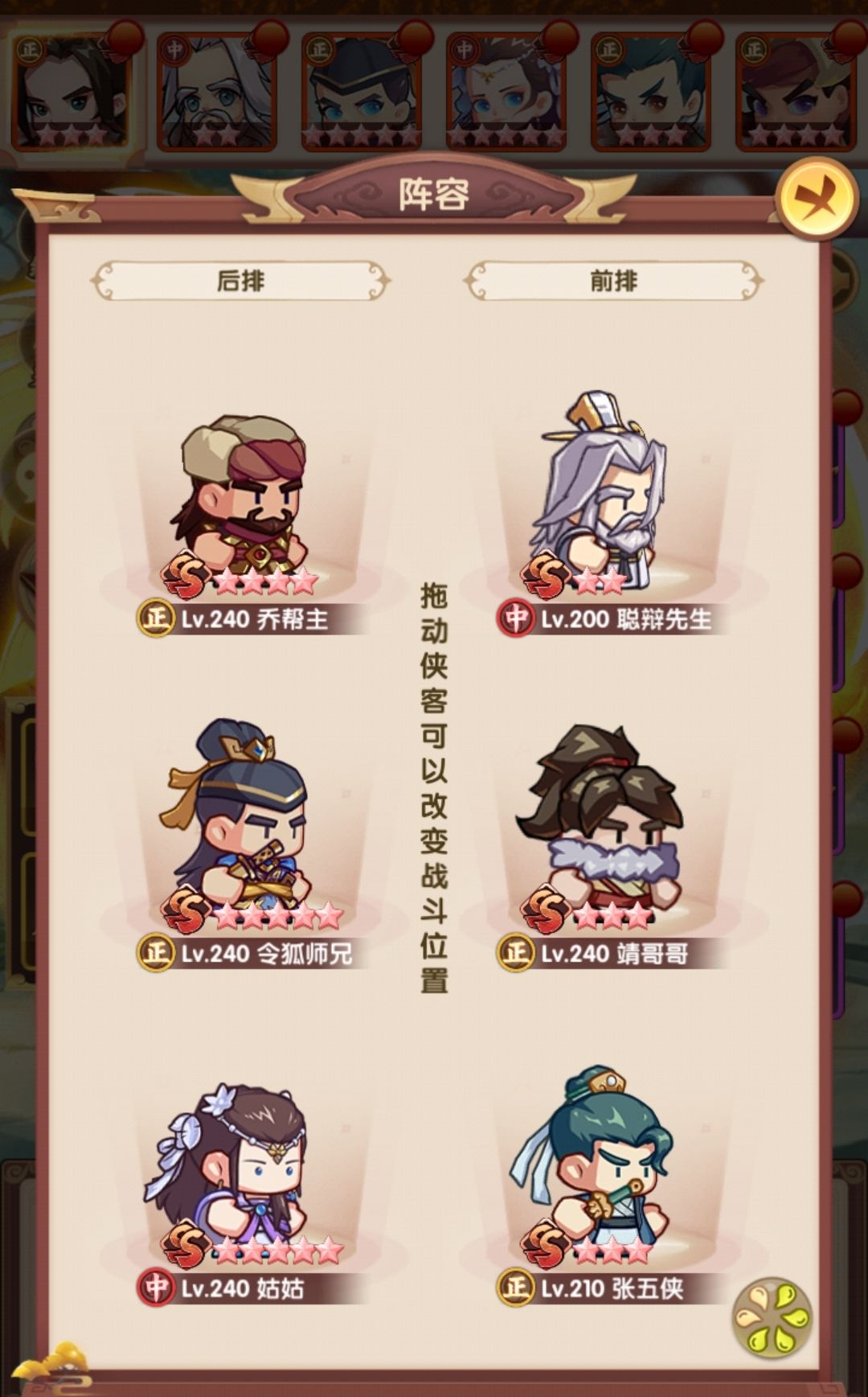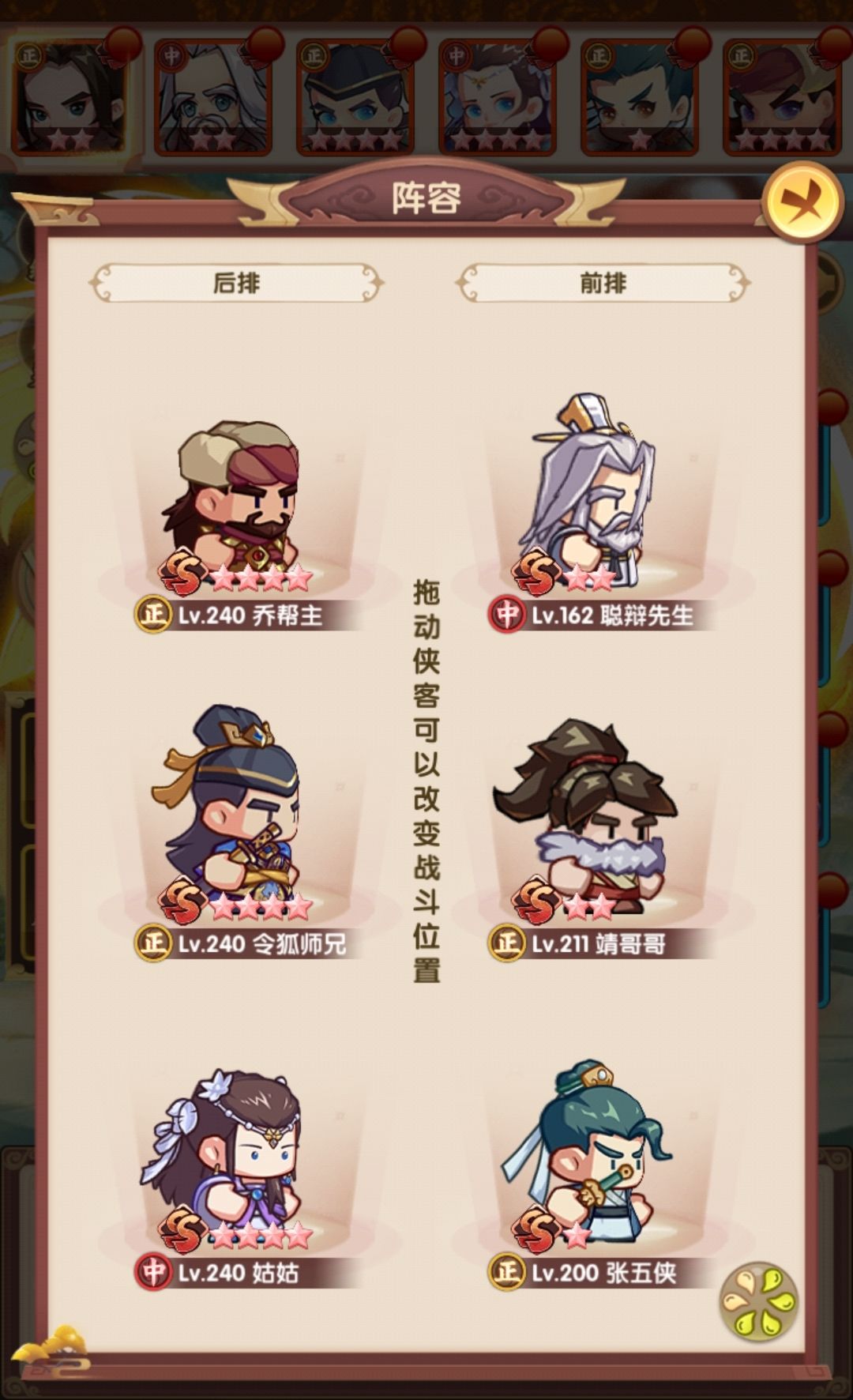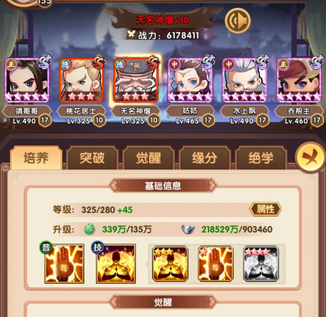 相比早上,在阵容层面把薛神医换成了聪辩,由于之前留了几个聪辩的本体,因此直接上红,再配合爬塔给的拜访卷,直接红二,把技能点出来,乔帮主之前有2张本体没资源升,500以后的拜访卷实际上没怎么用,一波把姑姑和乔帮主拉到红四,技能点出来,实际上靖哥哥本体也够了,缺狗粮所以暂时还是红二,张五侠红四技能感觉很有用,但因为差的比较多,先不搞,阵容如下:
