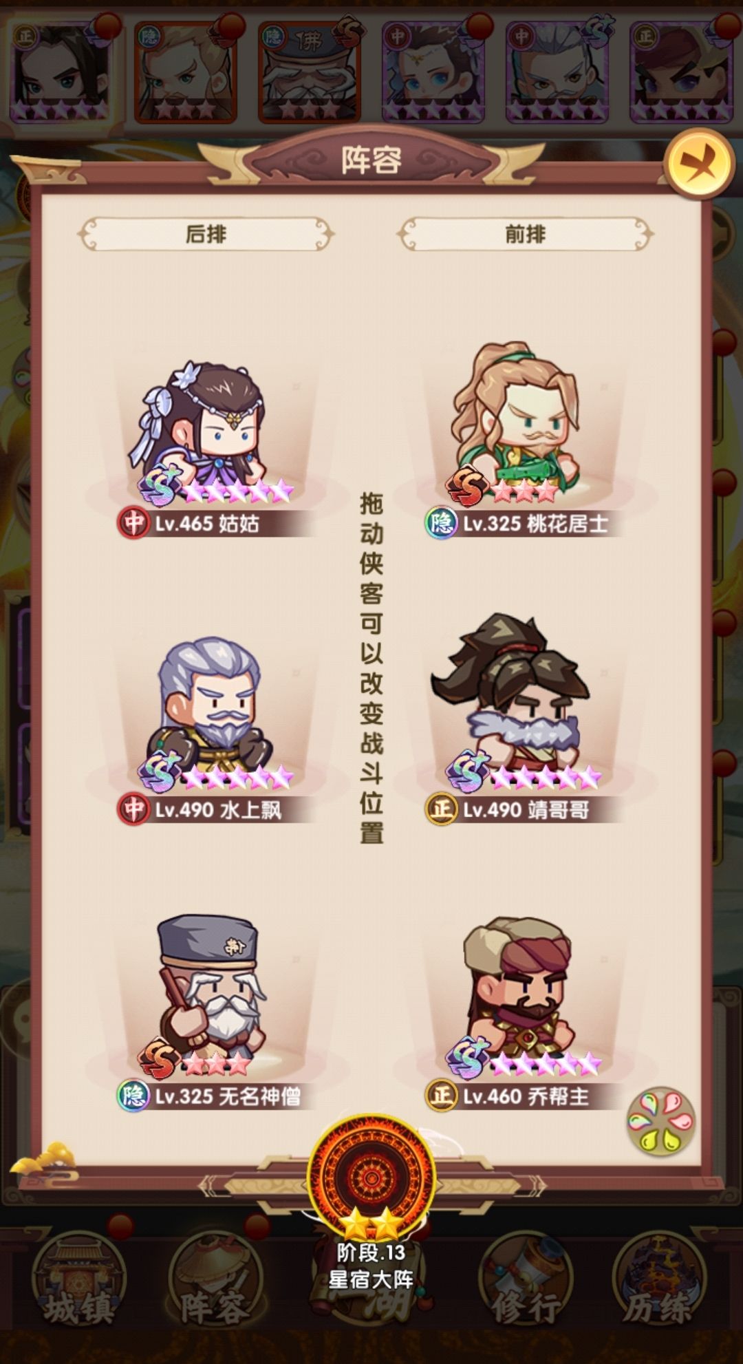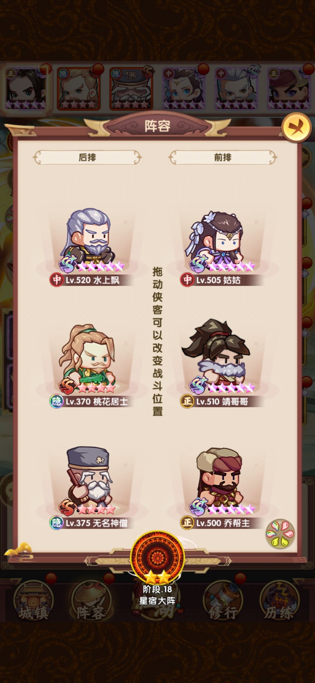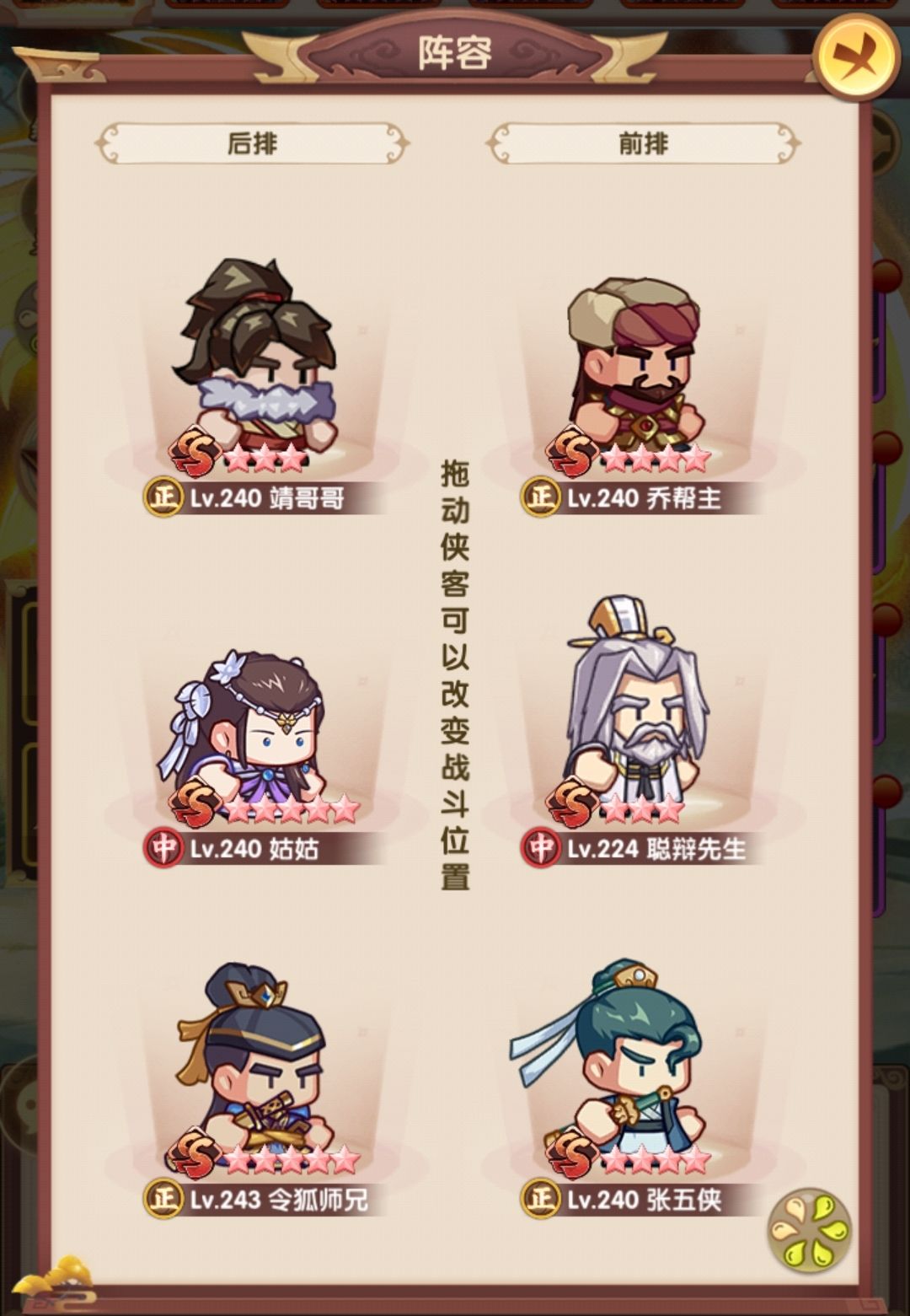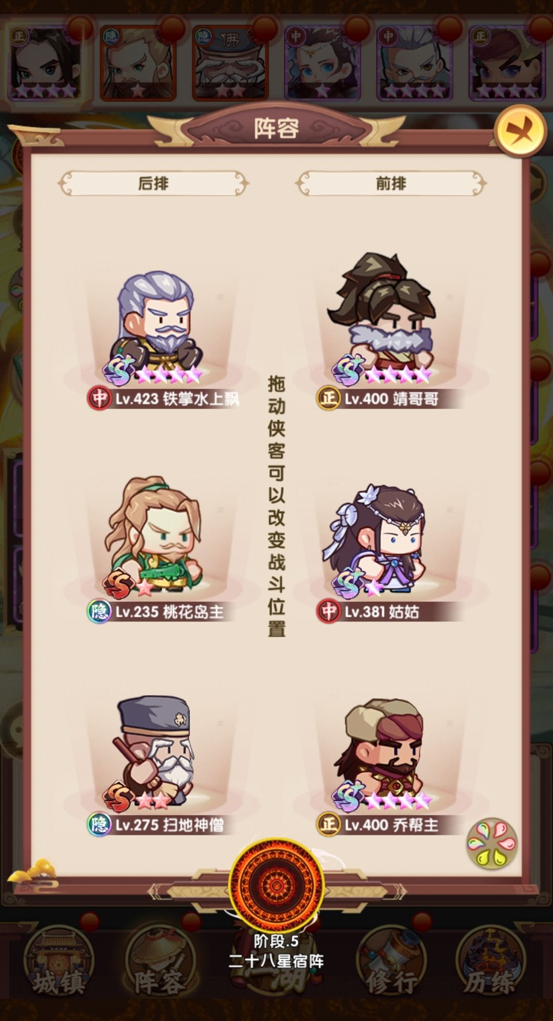 相比早上,在阵容层面把薛神医换成了聪辩,由于之前留了几个聪辩的本体,因此直接上红,再配合爬塔给的拜访卷,直接红二,把技能点出来,乔帮主之前有2张本体没资源升,500以后的拜访卷实际上没怎么用,一波把姑姑和乔帮主拉到红四,技能点出来,实际上靖哥哥本体也够了,缺狗粮所以暂时还是红二,张五侠红四技能感觉很有用,但因为差的比较多,先不搞,阵容如下: