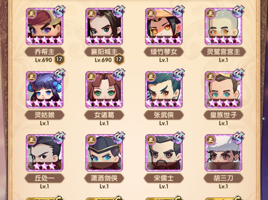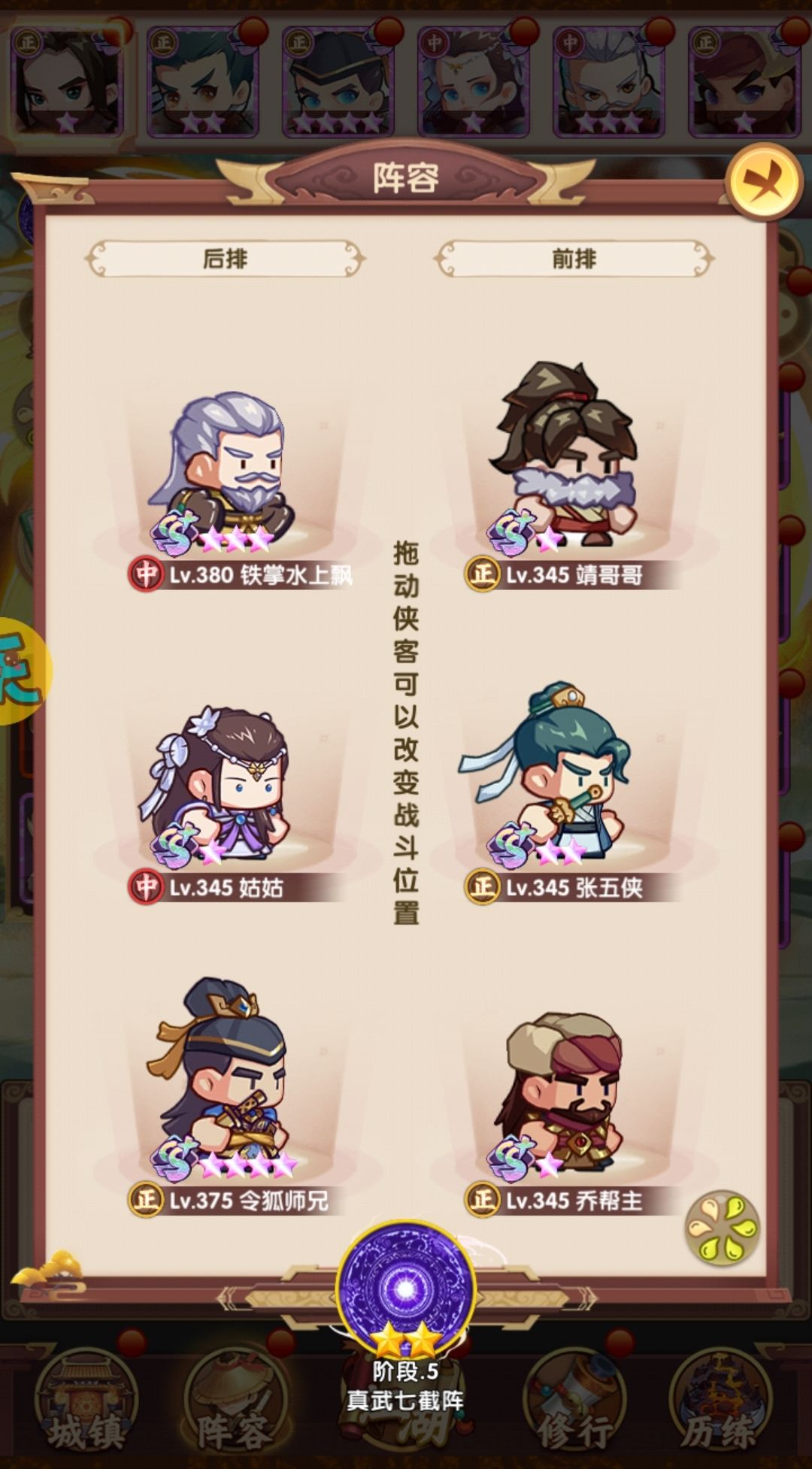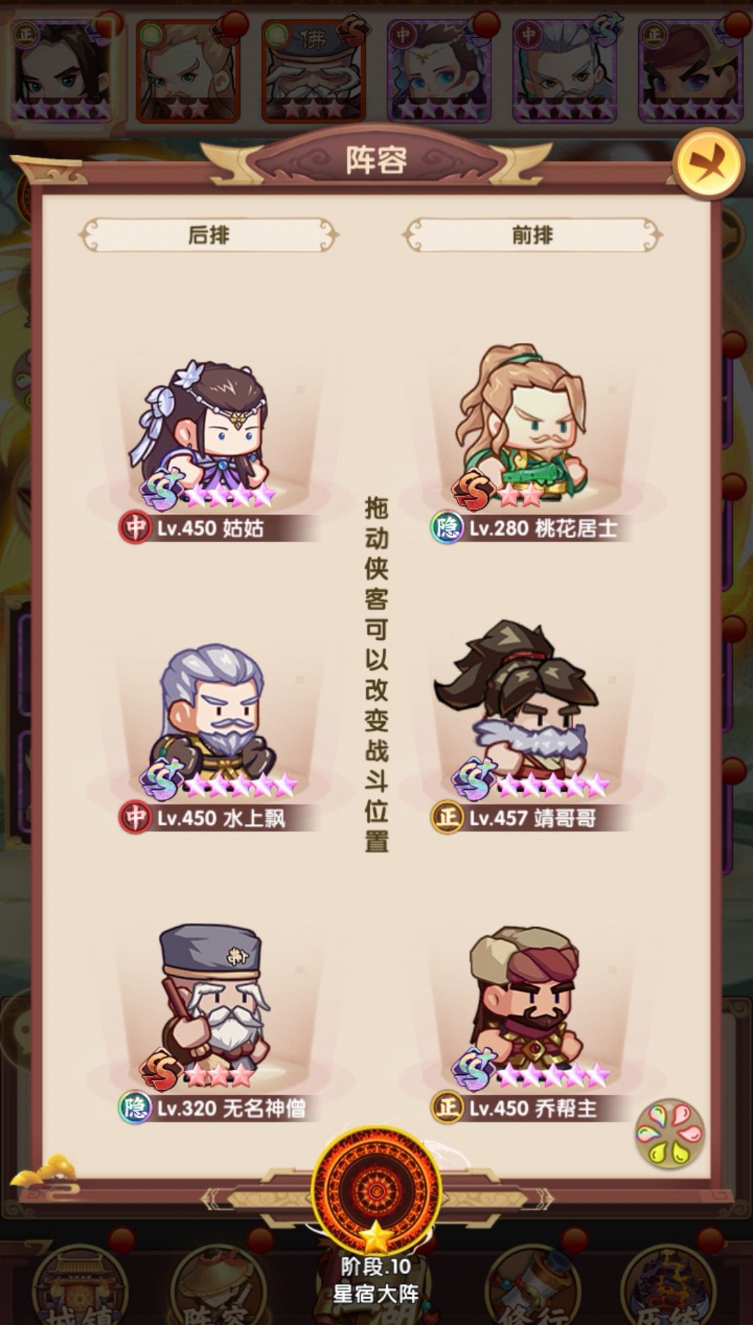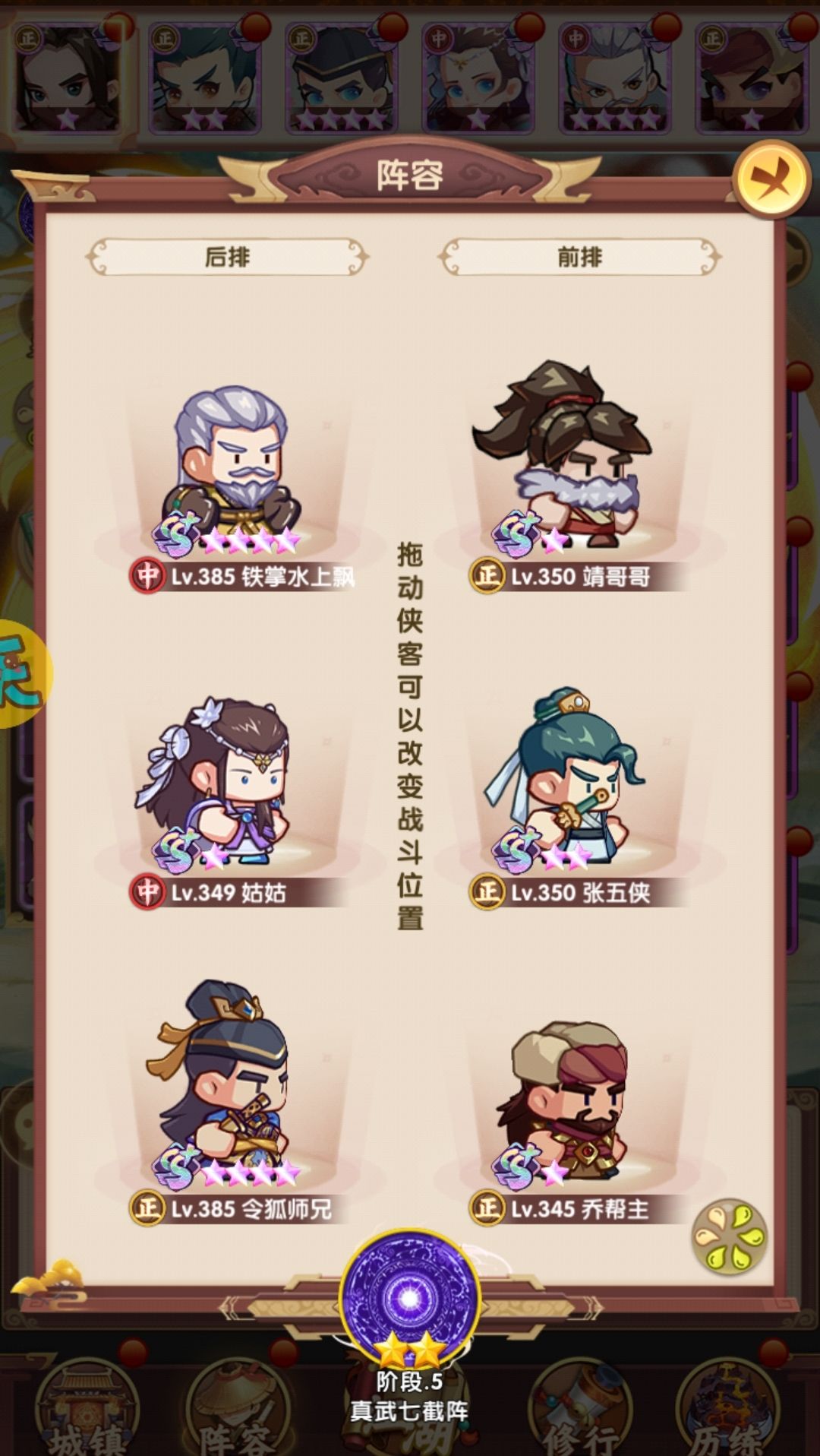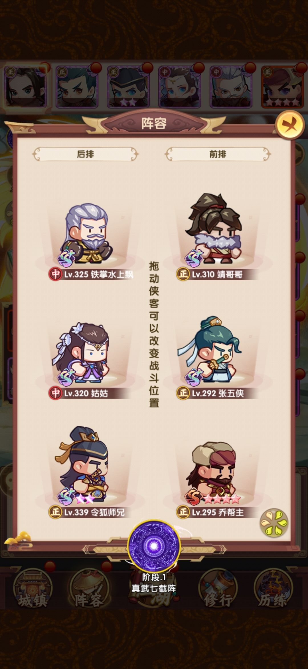 相比早上,在阵容层面把薛神医换成了聪辩,由于之前留了几个聪辩的本体,因此直接上红,再配合爬塔给的拜访卷,直接红二,把技能点出来,乔帮主之前有2张本体没资源升,500以后的拜访卷实际上没怎么用,一波把姑姑和乔帮主拉到红四,技能点出来,实际上靖哥哥本体也够了,缺狗粮所以暂时还是红二,张五侠红四技能感觉很有用,但因为差的比较多,先不搞,阵容如下: