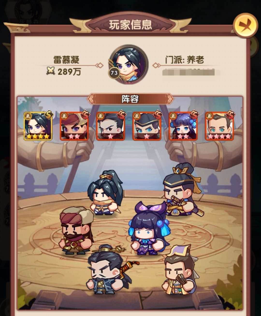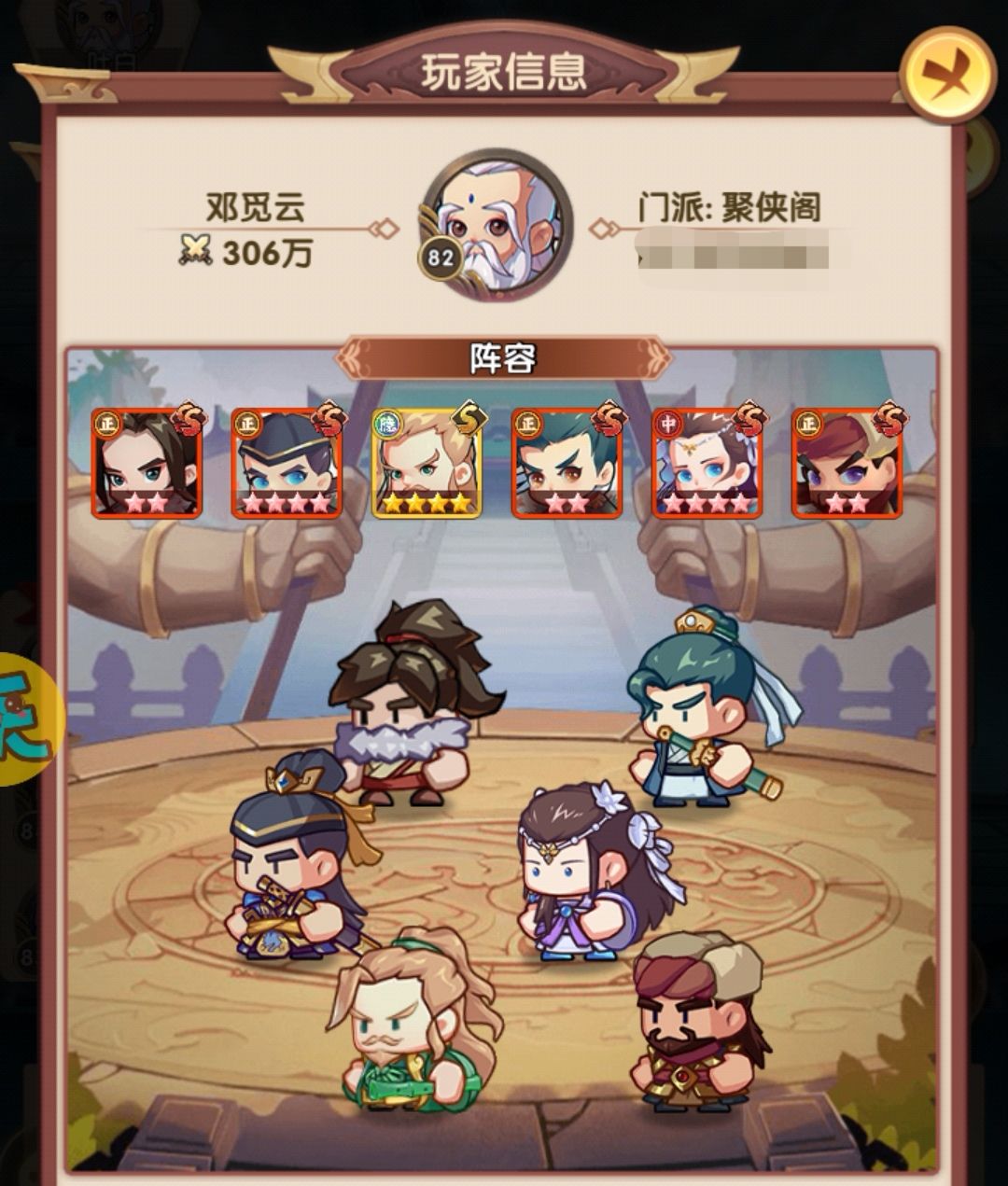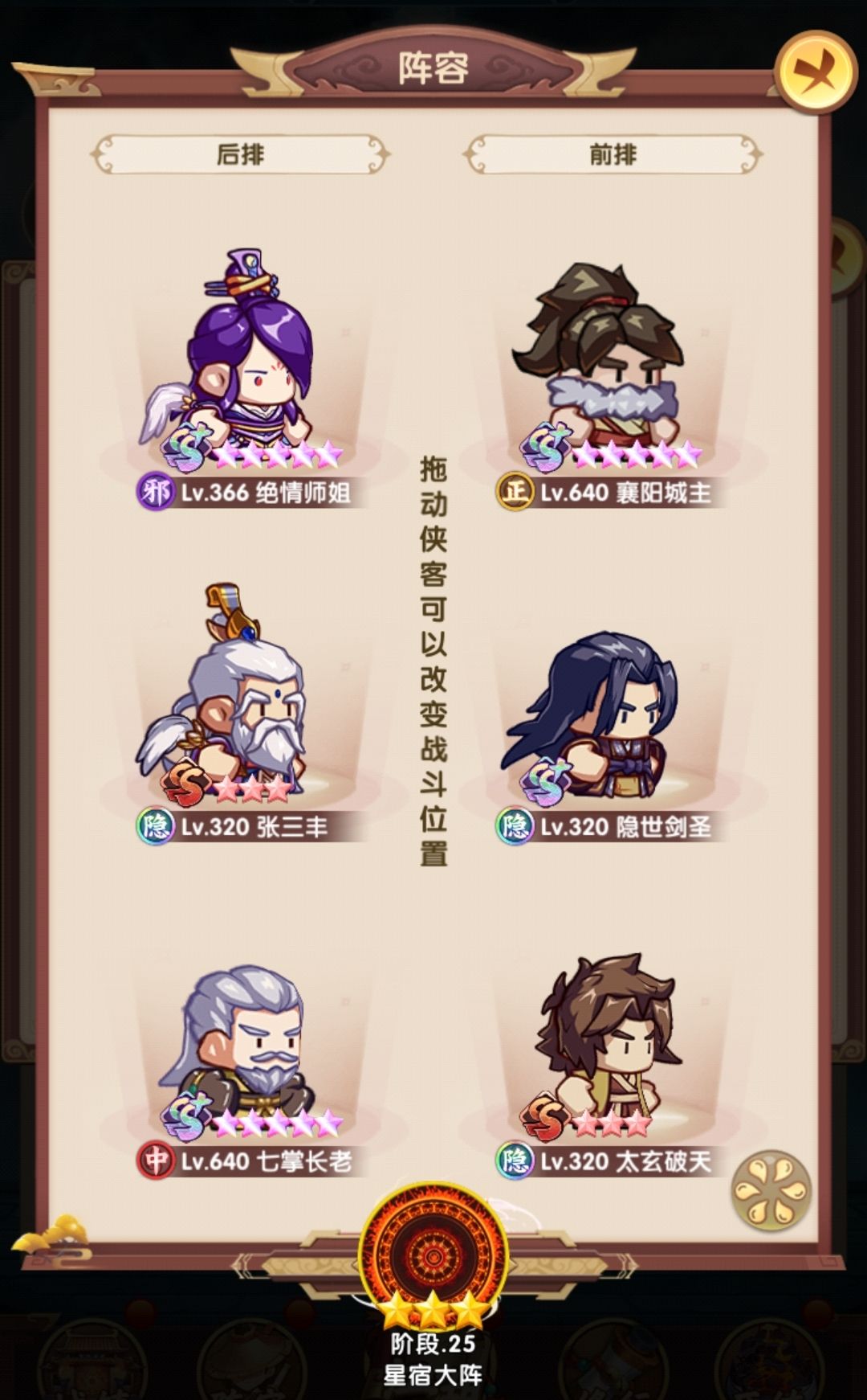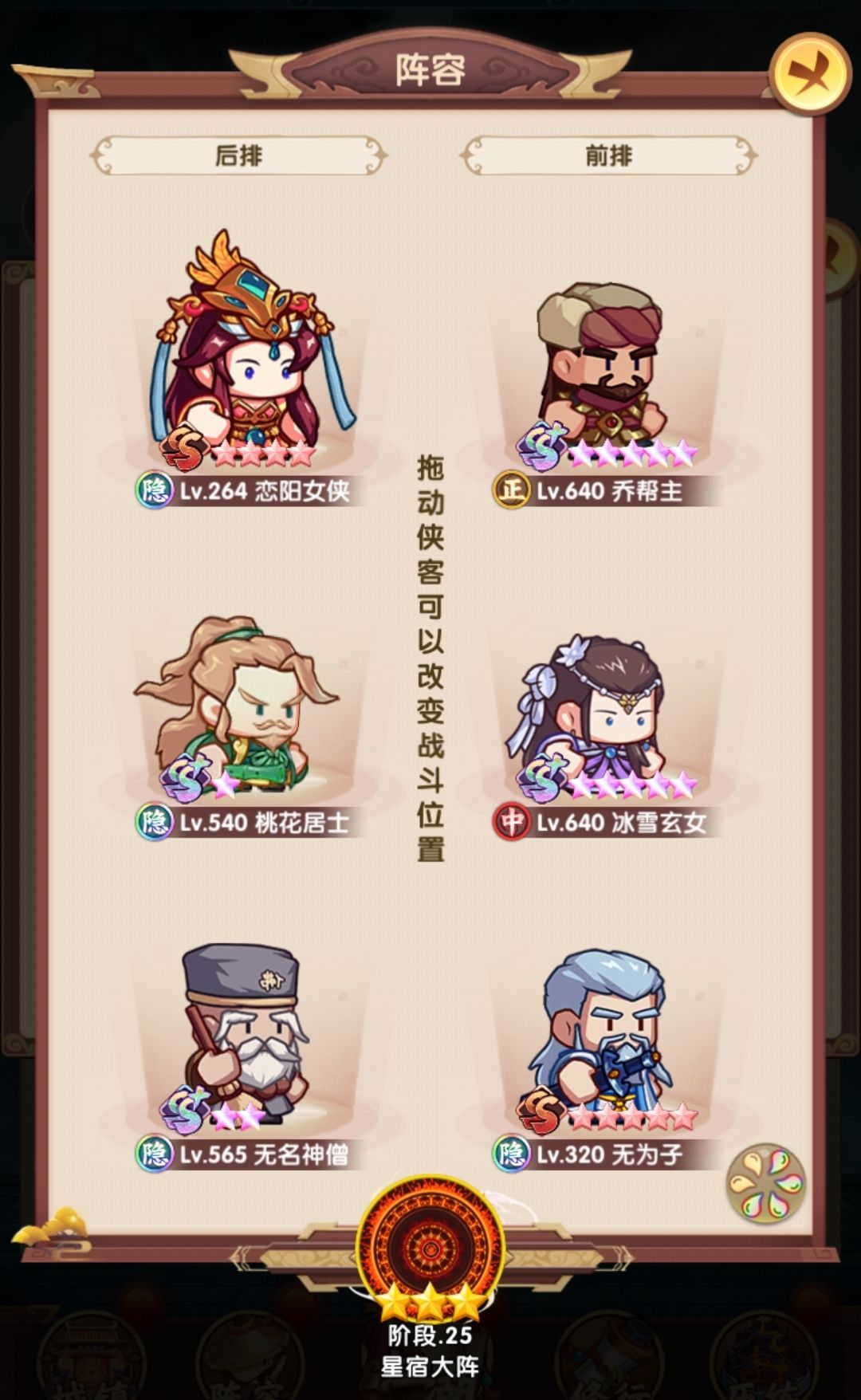 相比早上,在阵容层面把薛神医换成了聪辩,由于之前留了几个聪辩的本体,因此直接上红,再配合爬塔给的拜访卷,直接红二,把技能点出来,乔帮主之前有2张本体没资源升,500以后的拜访卷实际上没怎么用,一波把姑姑和乔帮主拉到红四,技能点出来,实际上靖哥哥本体也够了,缺狗粮所以暂时还是红二,张五侠红四技能感觉很有用,但因为差的比较多,先不搞,阵容如下: