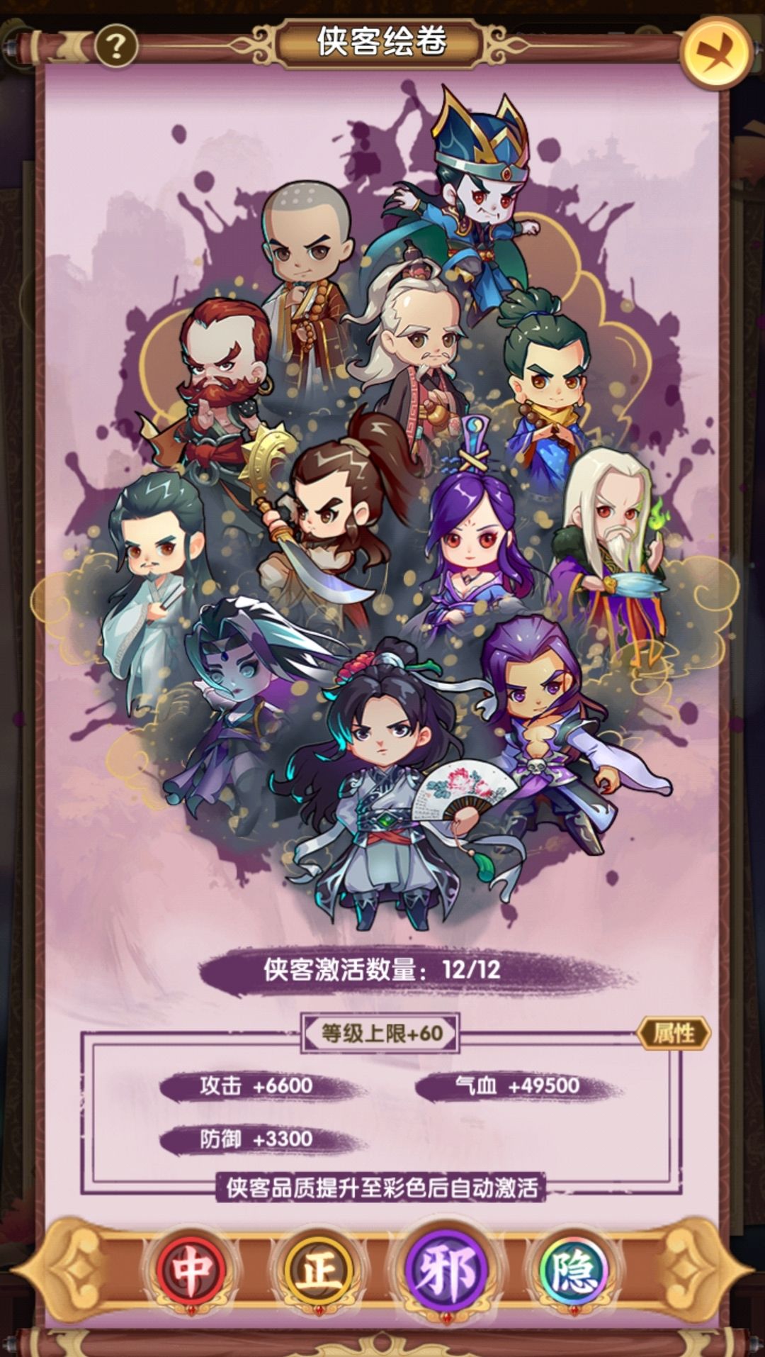 之前说过乐趣在于抽隐,顺道把绘卷搞了,目前三个阵营的绘卷都全开了,属性加成感觉可有可无,不过人物等级的加成还挺多,这也导致经验不足,所以非主力阵容等级没怎么升,也是2000后爬塔慢的原因之一