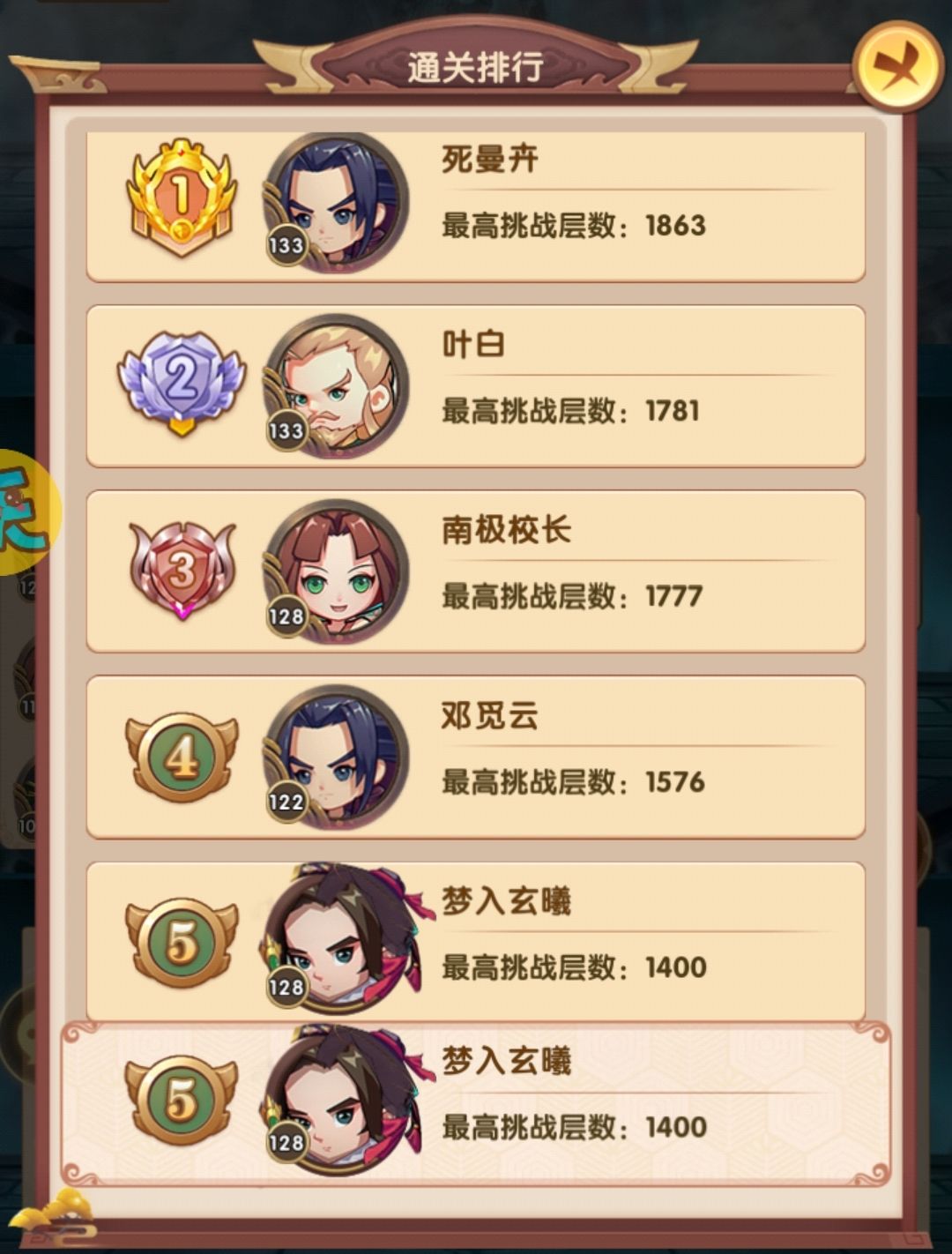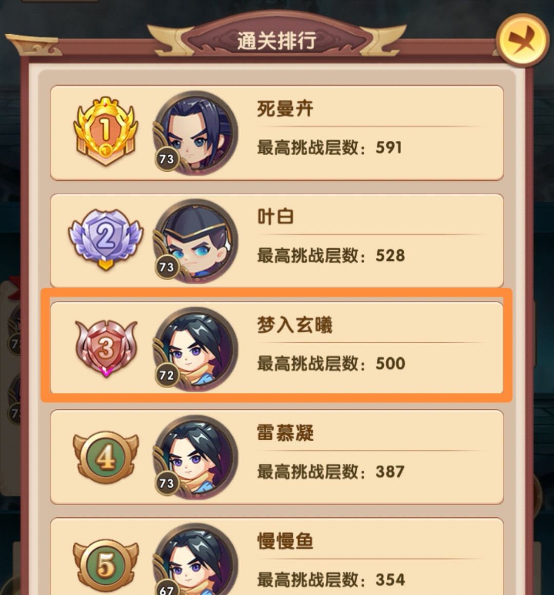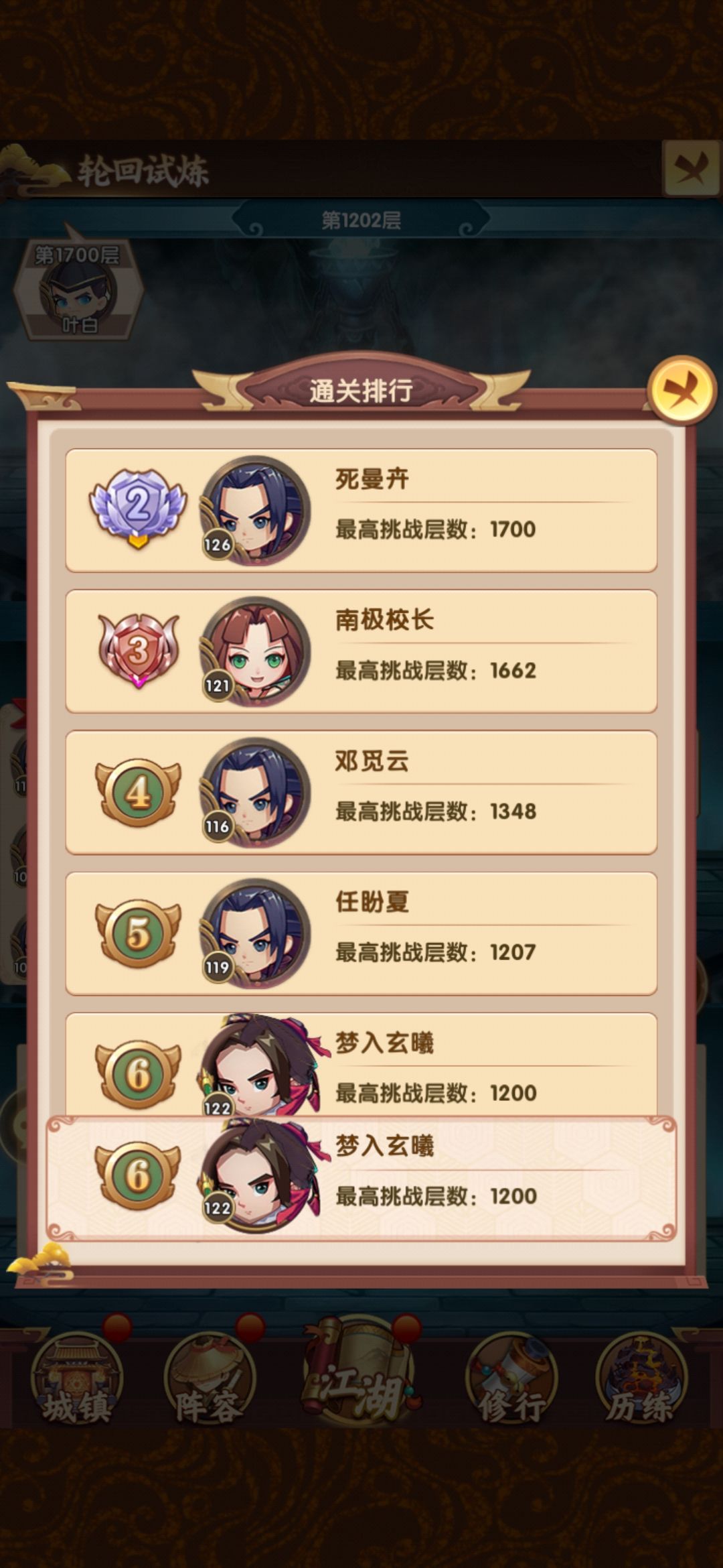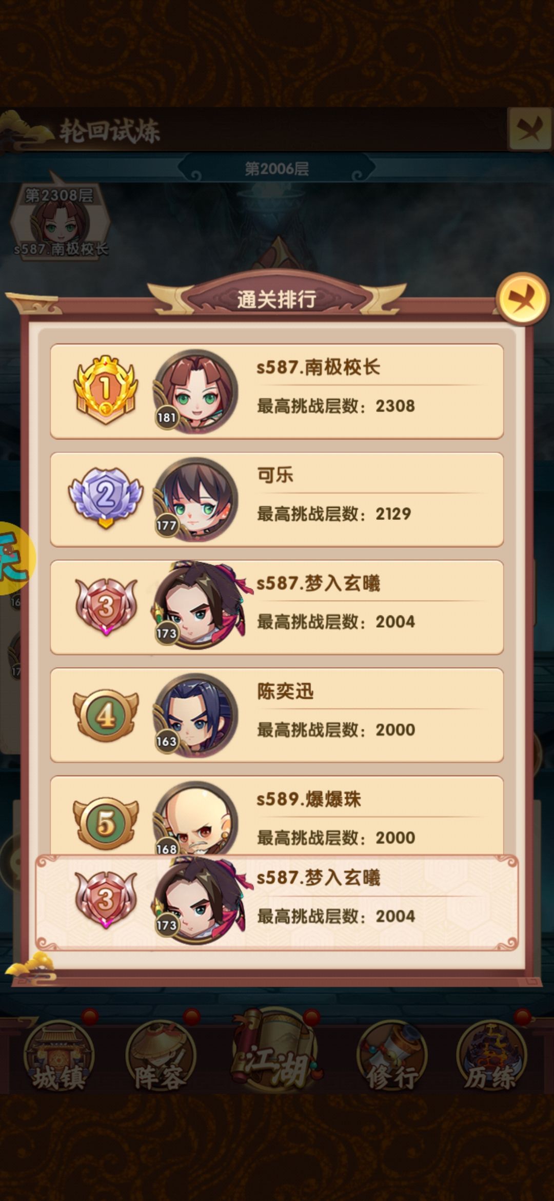排行第四的目前387层,战力289w,他的战力是高于我的,但阵容选择问题,爬塔效率并不高