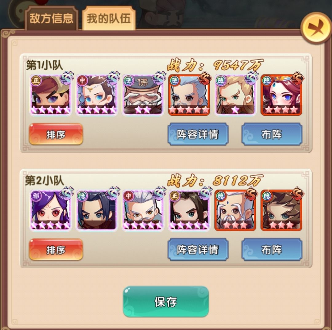 打不过了,上下对应两个位置互换调整,隐辅也可换成新的隐C做尝试,核心的逻辑还是基于原来的主力阵容,把核心辅助,C位按功能分成两队带其他小弟们打,当然也不是完全平分战力,就大部分关卡感觉第一队的实力会稍强,因此可以考虑给更多的资源