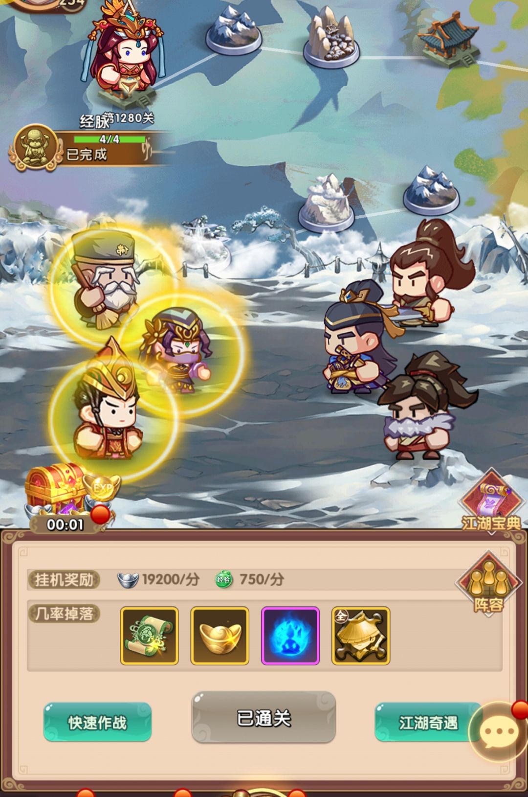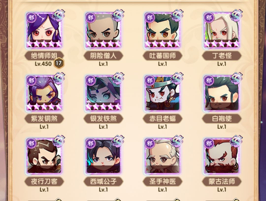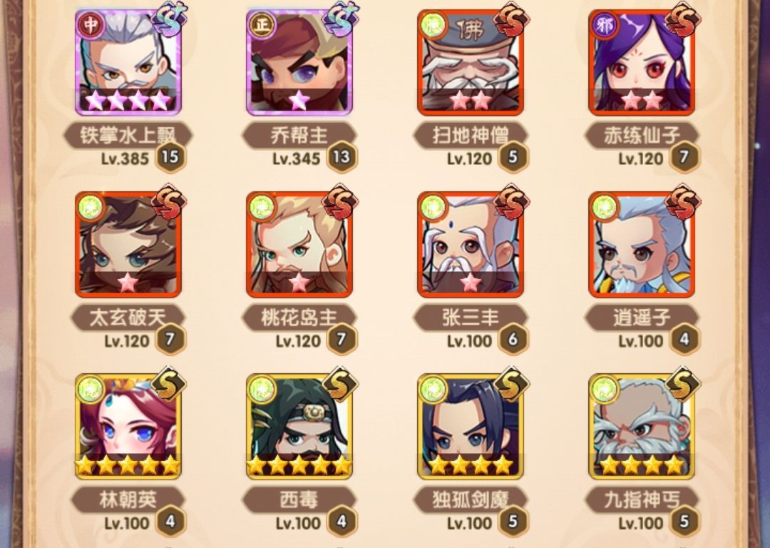 重置了令狐和张五侠后,换上扫地僧和桃花岛主,由于红星比较低,换完后还是把令狐和张五觉醒到了彩虹,触发等级提升的奖励,多余的材料把乔帮主和靖哥哥拉到了四星,虽然战力是掉了,但实战效果确实加强了,按现有强度应该可以试试能不能过1600