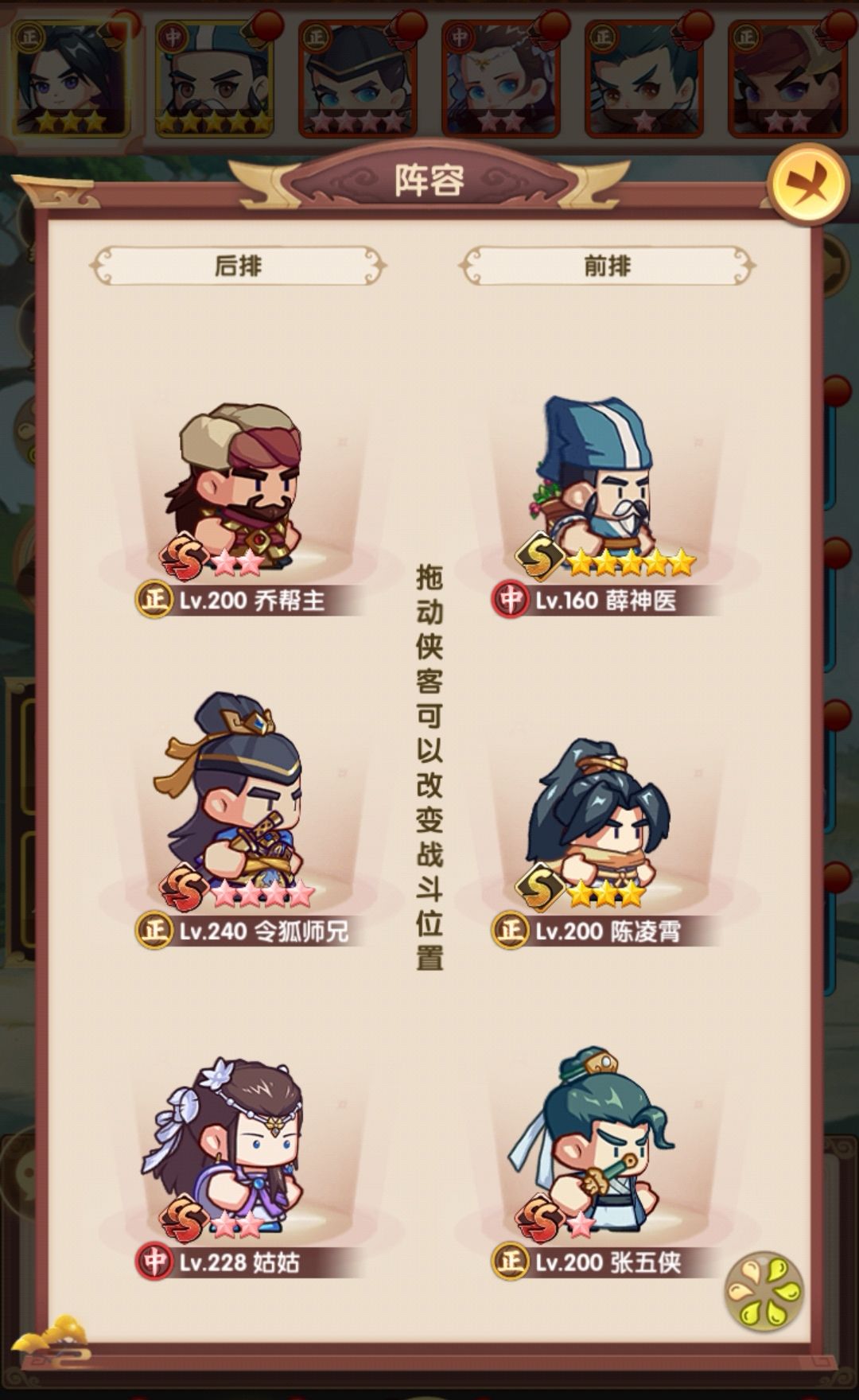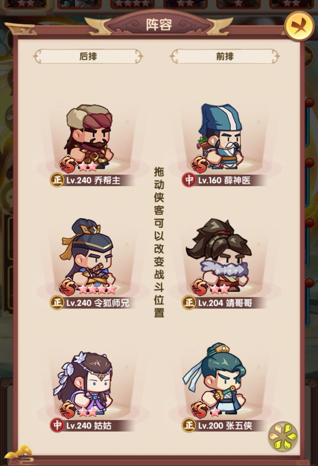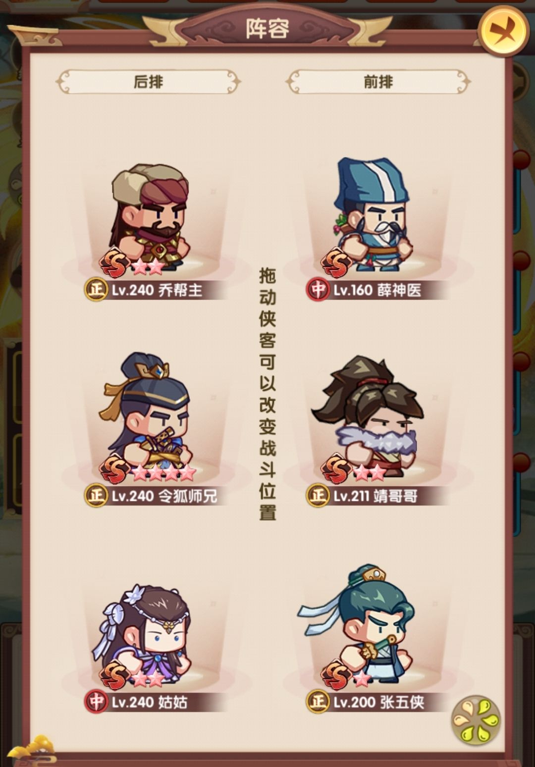 采用的是大部分攻略提到的赌狗阵容,姑姑+令狐+乔帮主为核心,辅助我搭配的是张五侠和薛神医,也可以按自己的卡池搭配