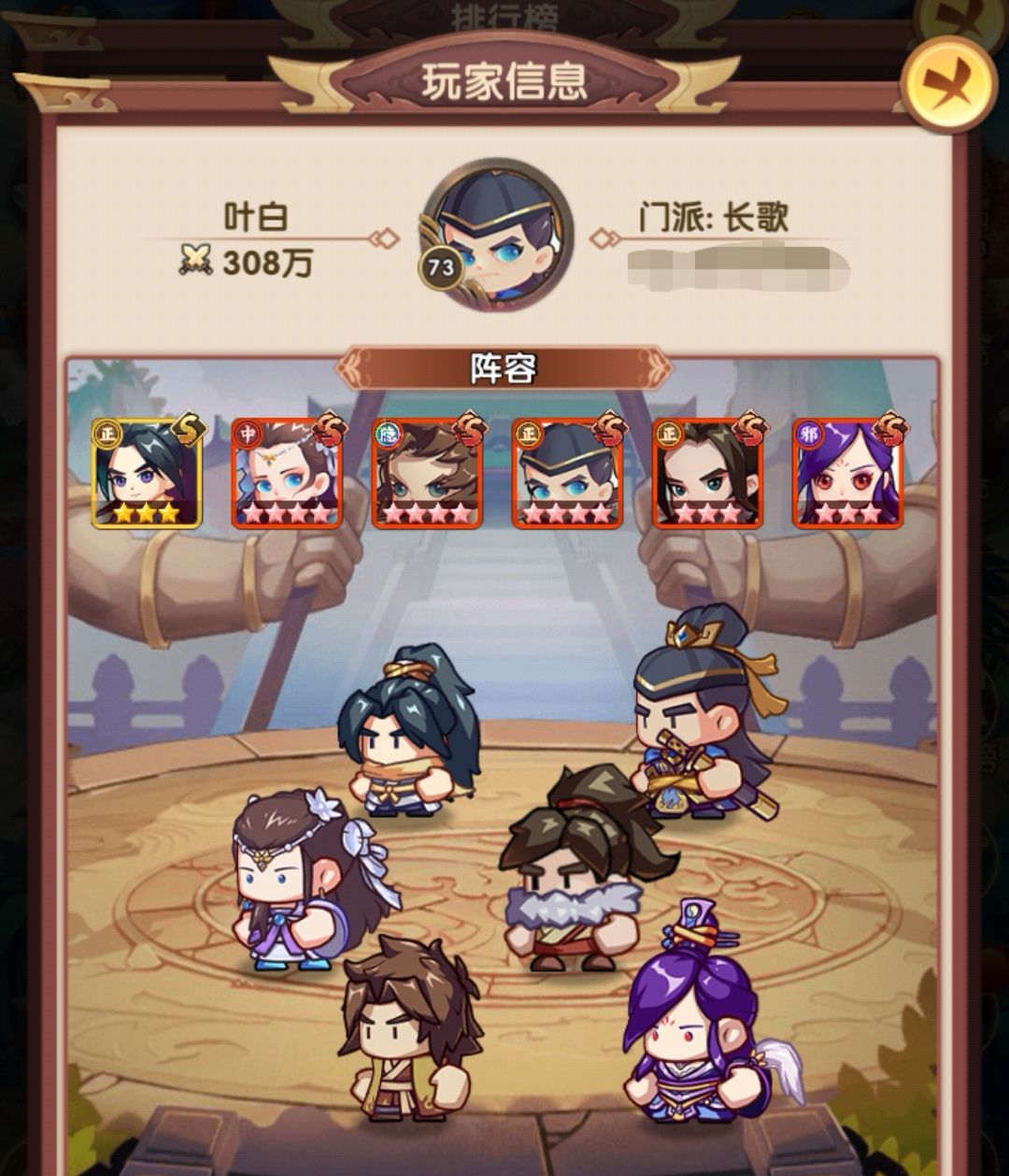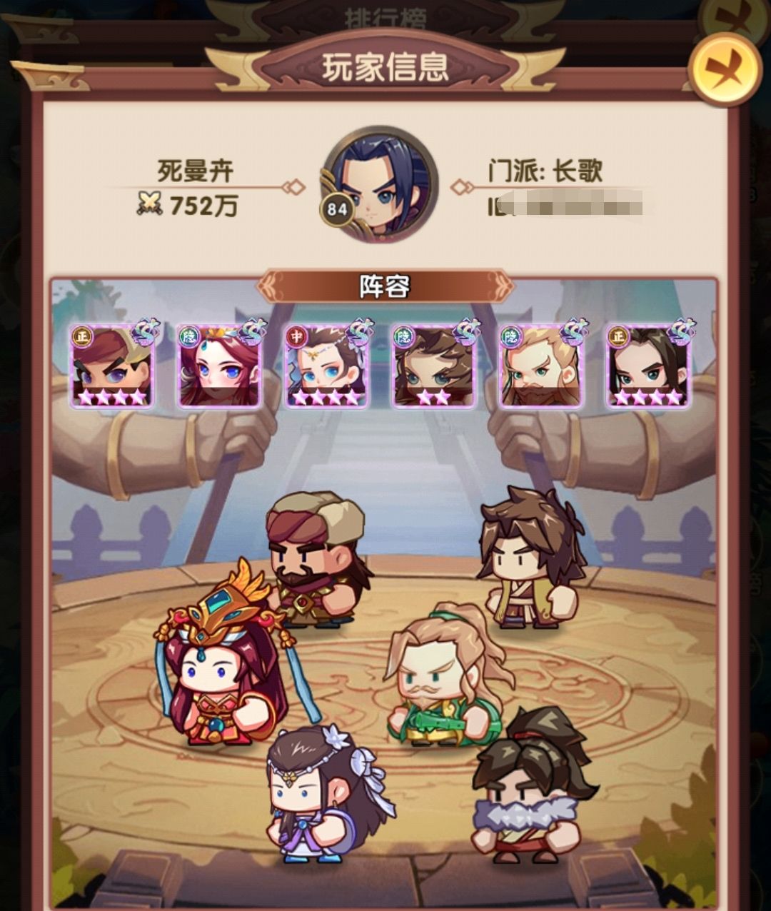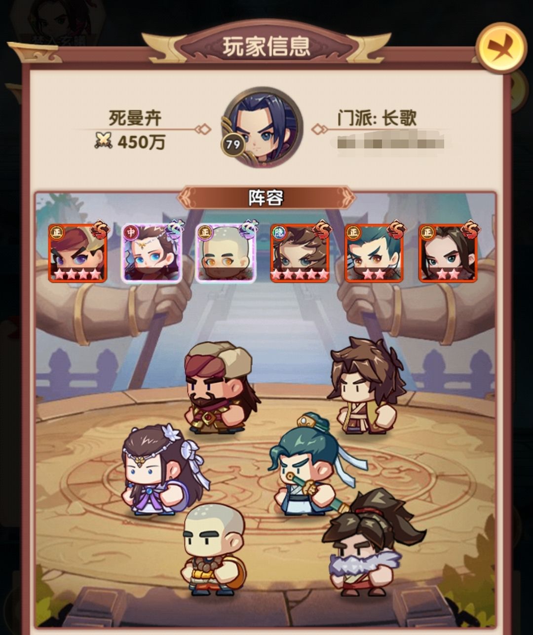采用的是大部分攻略提到的赌狗阵容,姑姑+令狐+乔帮主为核心,辅助我搭配的是张五侠和薛神医,也可以按自己的卡池搭配