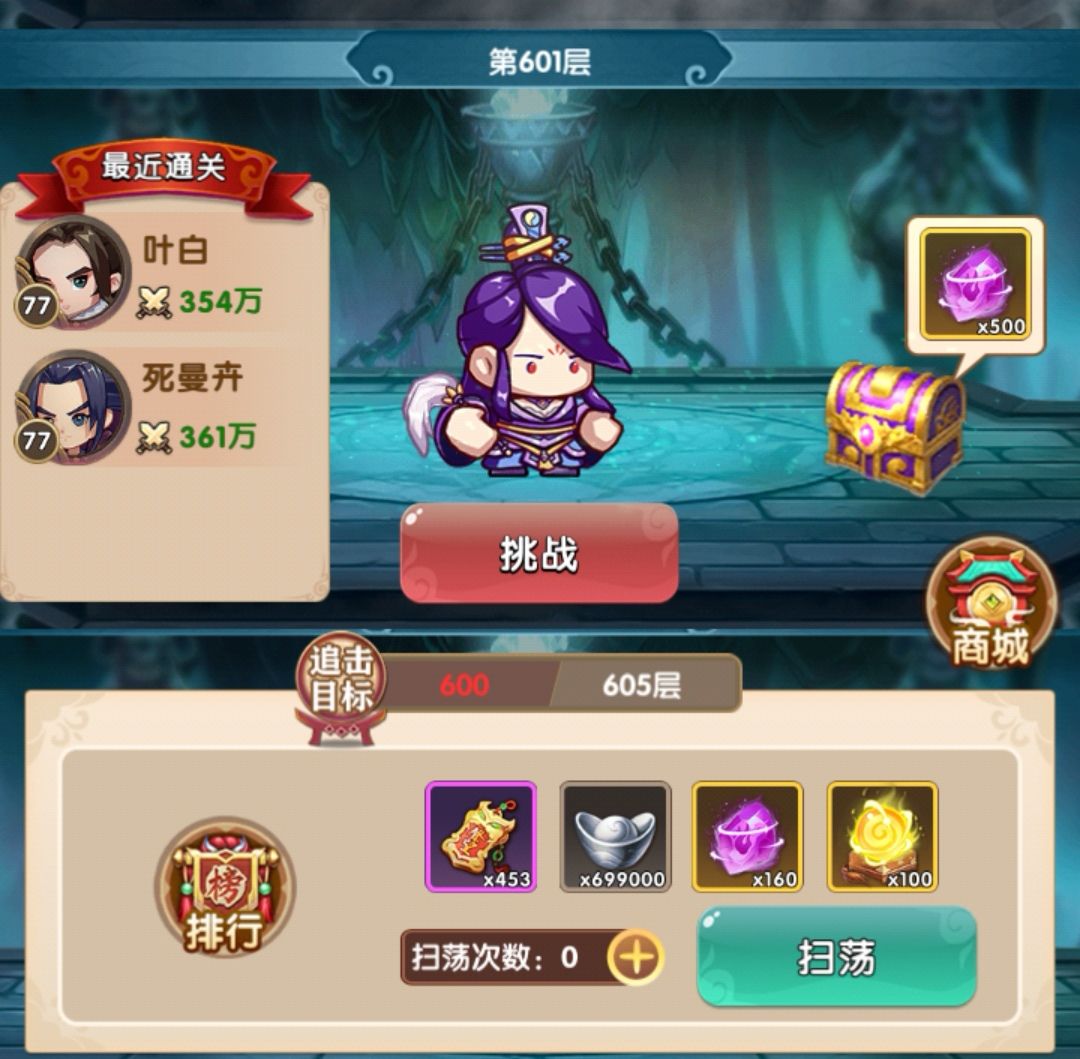 此时战力260w,爬塔效率明显提升,一口气爬到了600层