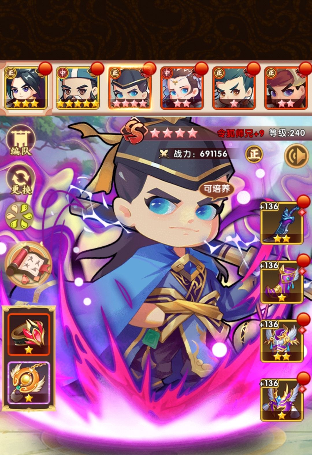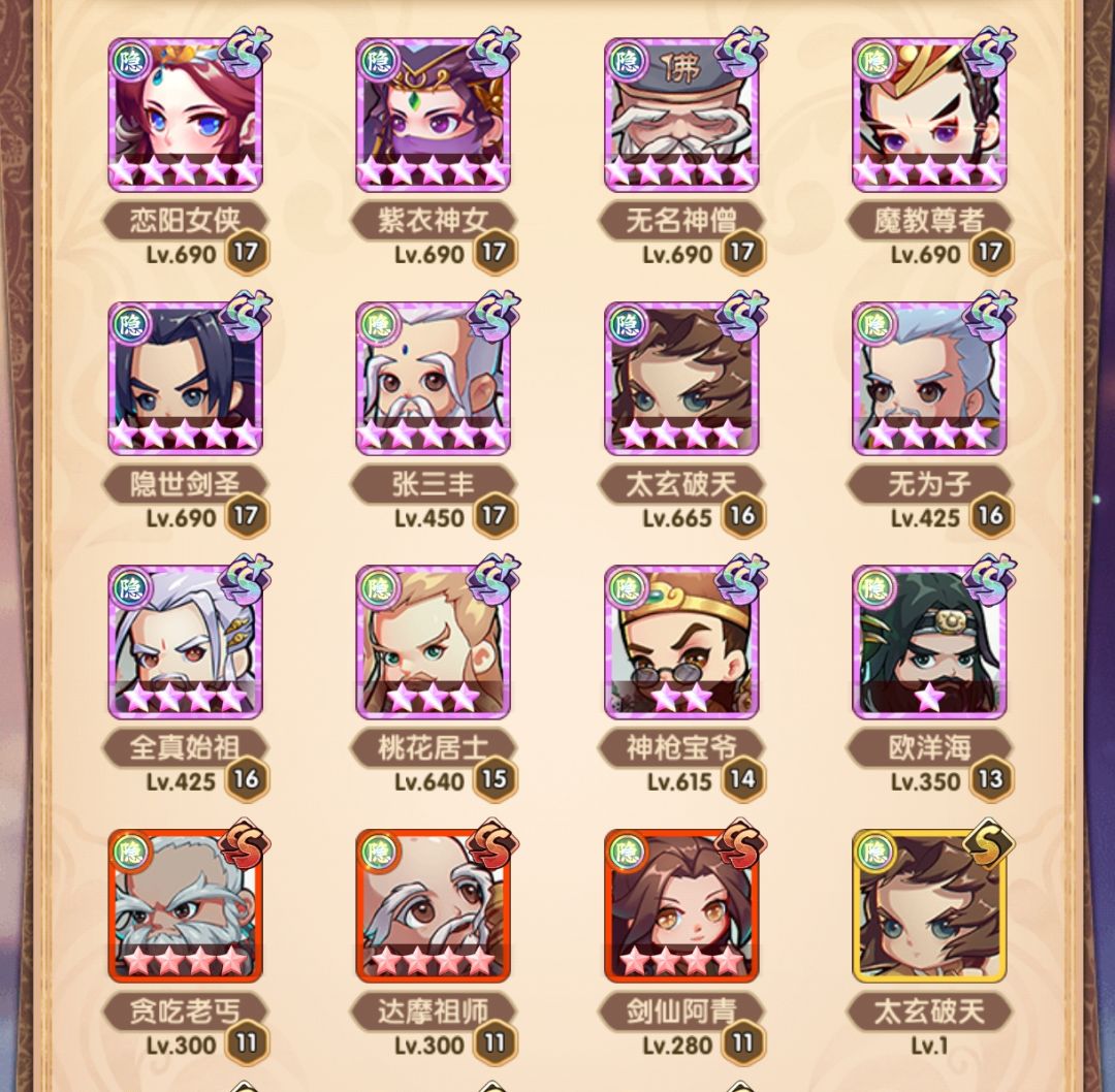 在1000层后,考虑到讨伐和山海异兽,以及五行的效率,在阵容上做了调整,把聪辩换成了铁掌,增强单体输出,有狗粮就升下星,渐渐的也有5个ss+