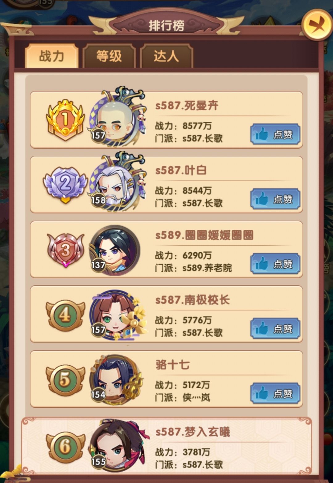 排行榜有些变化,原因是合服了,应该是587-590四个服务器合在一起,原本已经登顶的玩家不显示了,不过也可以从战力排行参考下,在前面的人应该也不多