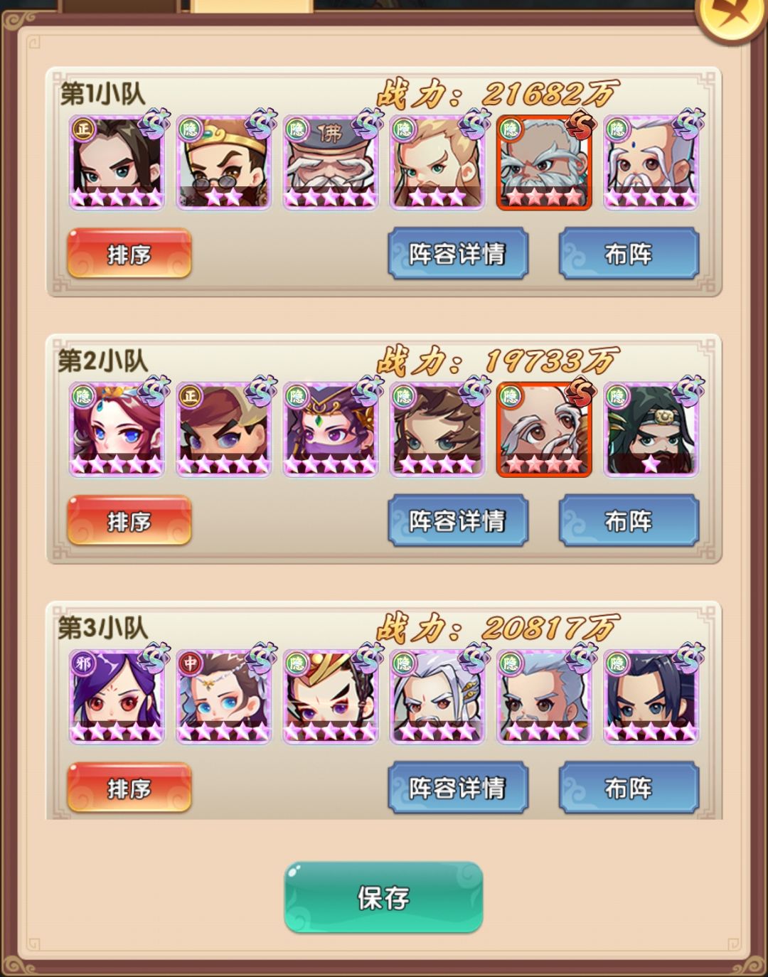 大概2200以后就需要3队了,具体是2200还是2300不记得了,这里就带来一个问题之前2队的时候培养方向如何,我的建议是全力养成隐阵容,没必要为了爬塔单独去培养太多的常规阵营,我自己也是慢慢等了好久,后面能凑三队了才慢慢又爬起来的,三队情况如下,灵活调整参考就行