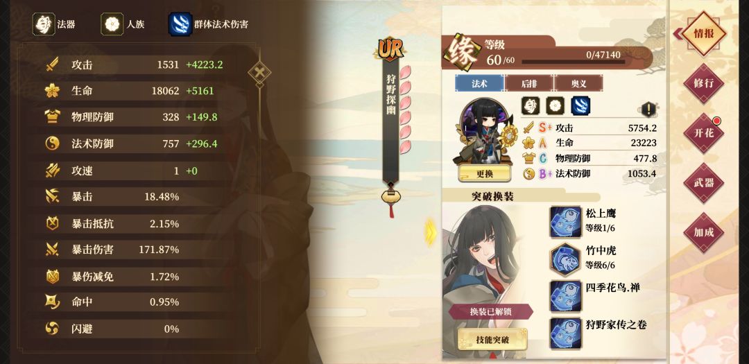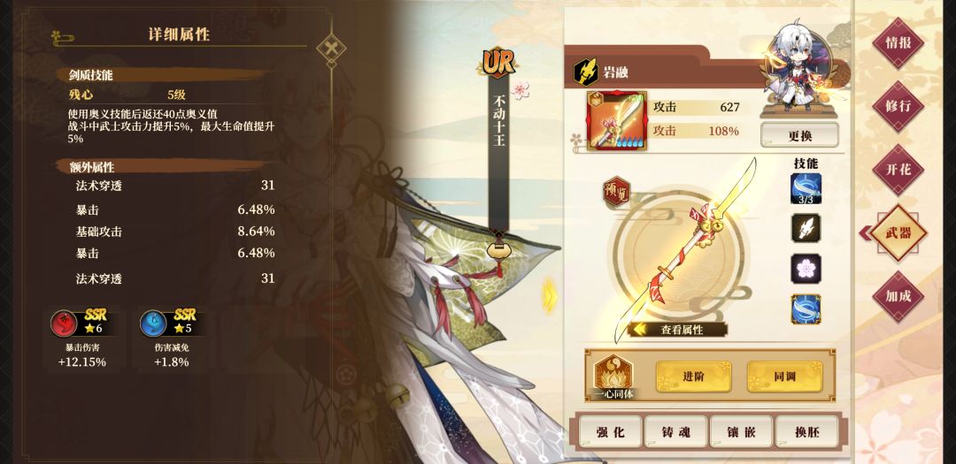 今天一时兴起,就把十王毕业了(不要在意等级),感觉还是很强的,武器用的一般残心。输出可以说爆发是可以媲美未装备专武一刀的,但是持续输出绝对是法系一流,大范围伤害形奥义的格挡与加暴击以及对团队的属性加成都是很不错的,专武后搭配酒井,不考虑武器属性基本可以全程满爆,可以说是后起之秀了。
