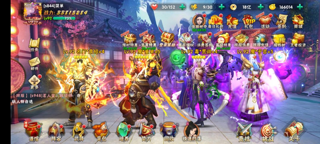 白嫖了92天,也是看刘大美人的贴子慢慢熟悉这个游戏,今天也说一说自己玩了这么久的一点心得,本人最喜欢玩的一个副本就是巅峰试炼了,现在战力3千万,到了160关,还没有卡关,因为我玩群国,就以群国为例说一说吧 1布阵 布阵最讲究,群国可以分为 1,控制组合2,控制+吸火力组合3,卡怪组合4,强势组合 控制组合武将:董卓+鬼吕布+马超,如果上四将可以加一个赵云, 这几个武将一般可以针对有加血的怪或者比将难啃的硬骨头,配合好几乎没有敌方出手的机会 2,控制+吸火力组合:袁绍+郭嘉+陆逊 这个组合里面袁绍起到了一个非常重要的作用就是吸引火力,只要他上场几乎火力全被他吸引了,郭嘉在旁边干就完了,但是群攻怪就是注意了! 3.3,卡怪组合 贾诩+ 其实没有组合,贾诩一个就够了,因为他是远程攻击,可以自疗,可以减怒,主要还是要会卡怪,好像有贴子教了怎么卡怪,我这里就不说了,如果怪多的关卡一定要把他们分开,逐个击破.但 是重要的一点就是最好不要打远程攻击的怪,好像卡不了. 4,强势组合 主养的于吉 实力担当,不用说,一个人过关 2装备 装备可以平衡武将,我因为主养于吉,一般会把于吉的魂石,圣器和宠物给贾诩,装备给袁绍.这样战力就会比较平均了, 就说这么多,大家有什么好的方法也可以一起交流交流.